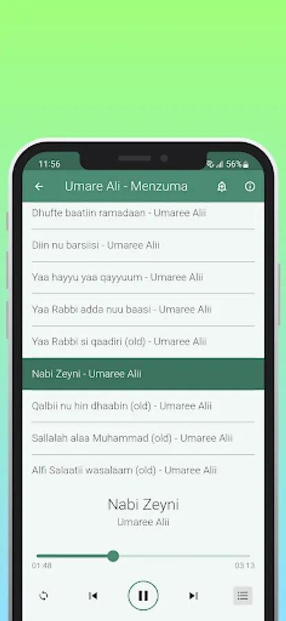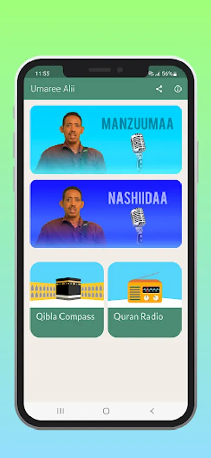 App kana keessatti nashiidaalee fi manzuumaan Munashid Umaree Alii qophaayee jira. kanneen duriifi kanneen dhiheenyaa qulqullina irra bareeda taheen argama. Dabalataan Kallattii Qiblaa fi Radio Sagalee qur'aanaa ni qaba. Barnoota fi qajeellumma gaarii akka irraa argattan abdii ni goona.