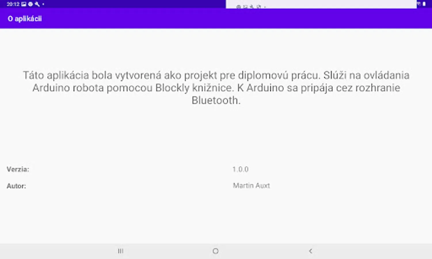 The Arduino control application was created for the practical part of the diploma thesis. It is intended for those who have an Arduino robot at home and will choose to travel on trips where they do not have a computer with them. With this application we will connect to the Arduino robot via Bluetooth. After a successful connection, we will see the Editor, in which we can use blocks to compile commands for the Arduino robot and play with it anywhere.
