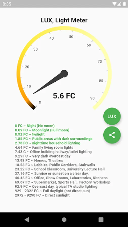 Lux Meter is a simple light meter for measuring illuminances (LUX, FC) by using the light sensor of your android device.