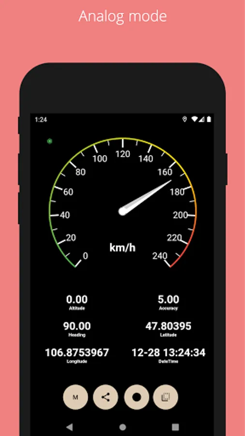 This application is a GPS-based Speedometer showing the speed of the device it is installed on. The speed is displayed both with an analogue gauge and as a digital value.