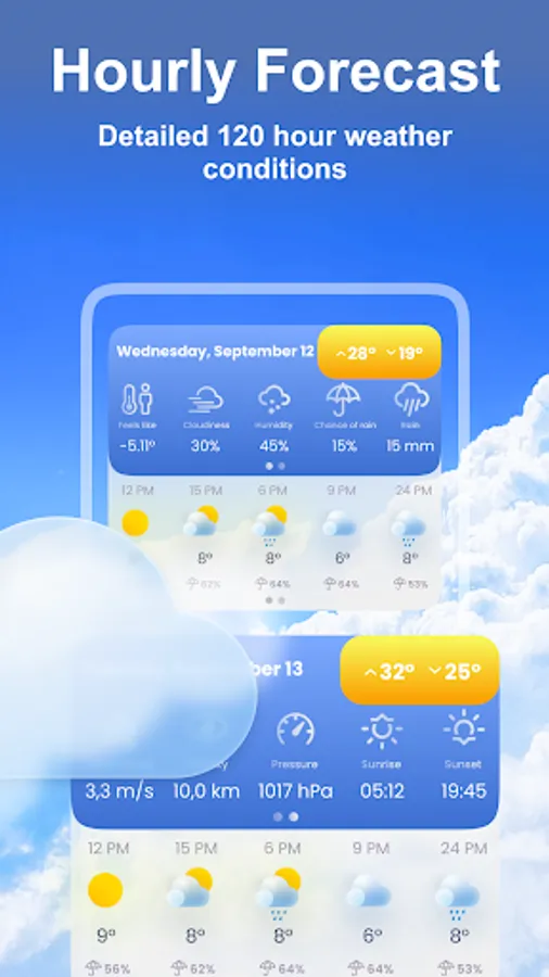 You'll get a chance to check the hourly weather any moment for the next 120 hours. You'll get to know in advance about any possible obstacles and will find ways to overcome them.