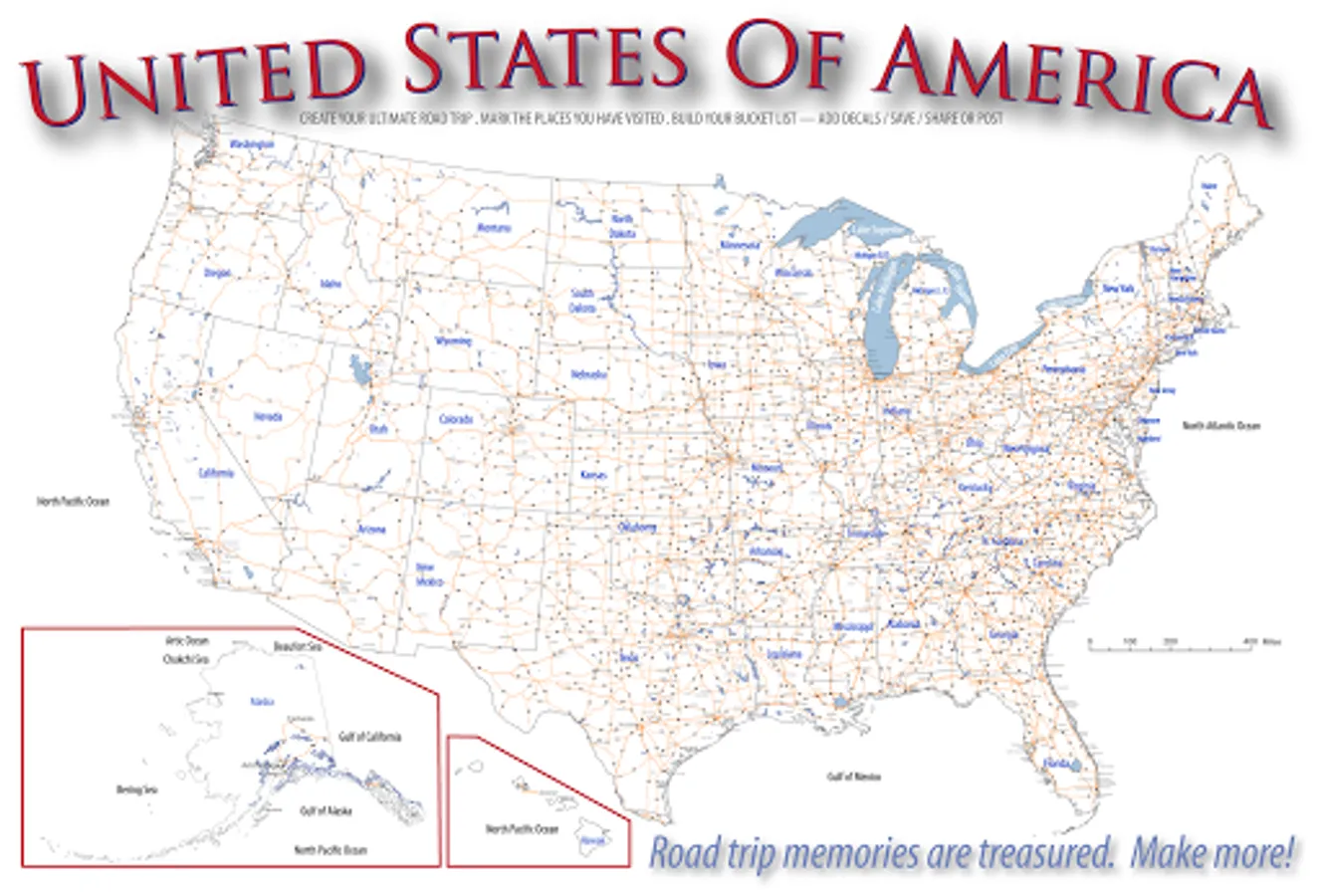 Create a road trip in the palm of your hands. Use decals to add the exciting things you experience on your trip. It's a DIY adventure! Plan your bucket list, choose your next vacation destinations and mark your route, decorate all of the states you have visited. Use the pencil to draw your route, place decals on areas you have visited or plan to explore, save your maps (so you can add to them), share in a text, email or social media or print your maps.