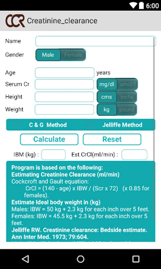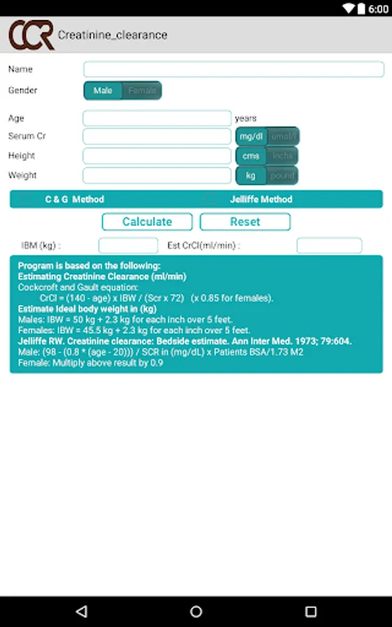 The Creatinine Clearance Calculator is a must-have application for any health care professional who performs this calculation regularly!
