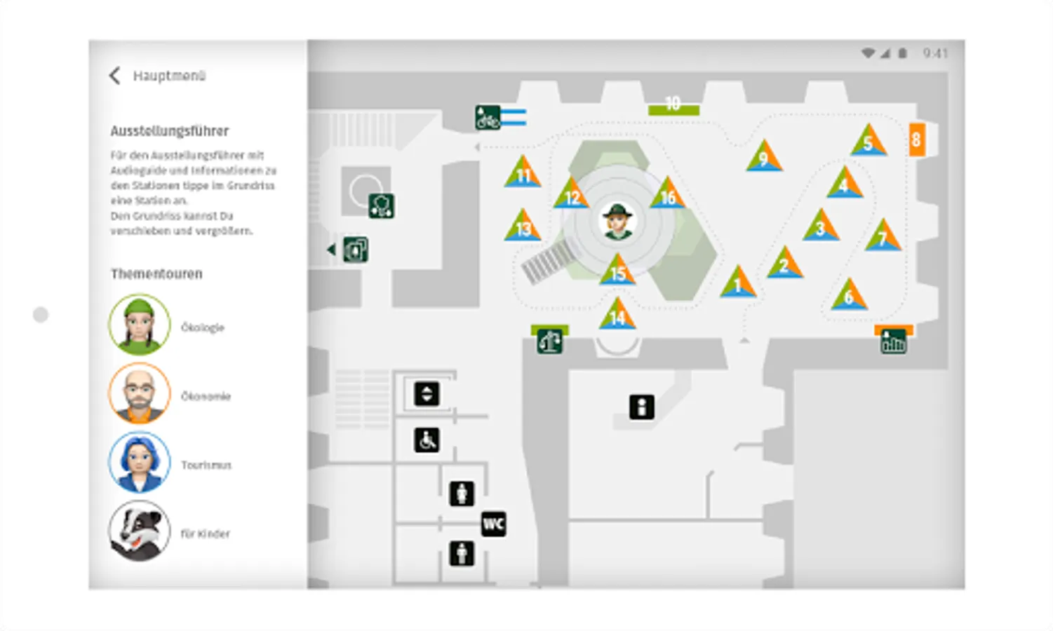 Waldtraut sees the forest as a place of relaxation and tranquility. Follow her on the tourism tour and see the beauty of the forest. The fact that the forest is also a high-yield asset is conveyed by Waldemar on his economy tour. He is convinced that the forest is first and foremost raw material supplier and employer. For Flora, however, the protection of the environment and nature is very important. On your ecology tour, you will learn why we urgently need to preserve our forest with its unique flora and fauna. Young naturalist leads the badger on his children's tour through the exhibition.