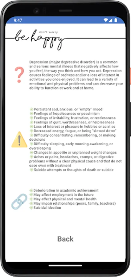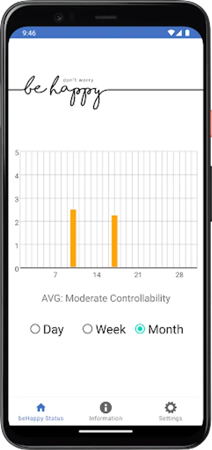 beHappy is a persuasive multimedia app where you can manage your mental health by enhancing your controllability awareness. Want to know how? Here are some of the features that make beHappy the perfect choice to make you always in control:
