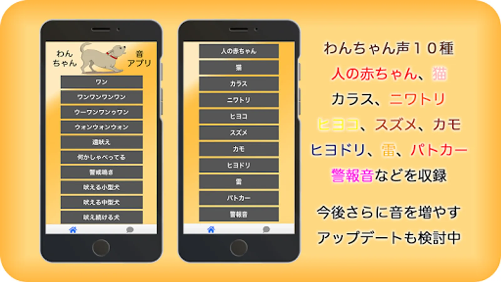 今後も需要がありましたら音の種類を増やして行きたいと思いますので、よろしければ愛犬ちゃんの反応やご要望などGoogle Playレビューに残して頂けると開発の際に助かります。
