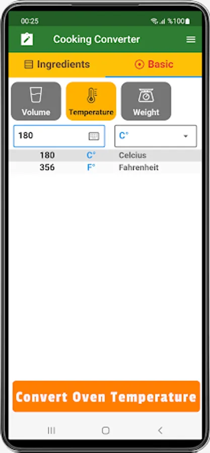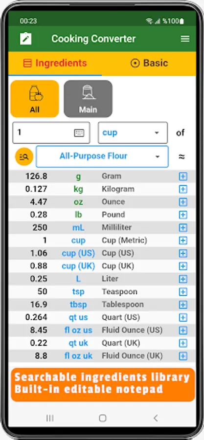 Cooking Converter is an app that allows you to easily convert ingredients from volume (cups, ml, tsp, tbsp, qt) to weight (g, kg, oz, lb), and vice versa, with many ingredients in its library.
