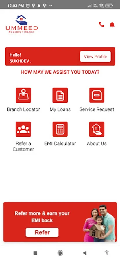 Customer can apply for loan or refer to other customer. The app offers a wide range of services for existing as well as prospective customers.