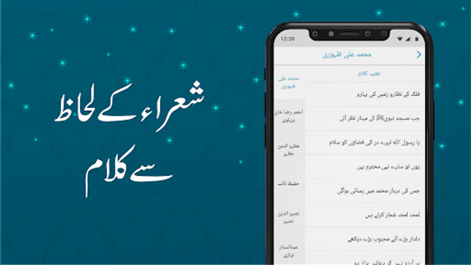 - Ahmad Raza Khan Barelvi , Muhammad Ali Zahoori , Hafiz Mazhar ud Din Mazhar, Hafeez Taib, Peer Naseer ud Din Naseer punjabi and urdu naats, Abdul Sattar Niazi naats, Ameer Minai naats, Khalid Mahmood Khalid, Iqbal Azeem, Saghar Siddiqui naats, Riaz Majeed naats, Muhammad Azam Chisti naats, Maulana Hasrat Mohani naats, Allama Muhammad Iqbal naats, Ahmad Nadeem Qasmi, Mansoor Afaq, Bedam Shah Warsi, Munawar Badayuni, Syed Sabhi uddin Sabhi Rehmani, Iftikhar Arif, Adeeb Raipuri naats, Sarwar Hussain Naqshbandi, Mahir ul Qadri(Manzoor Hussain), Aftab Naqvi naats, Akhtar Sheerani naats, Ehsan Danish naats, Altaf Hussain Hali, Zafar Ali Khan, Muhammad Ilyas Qadri and more are being added with the passage of time.