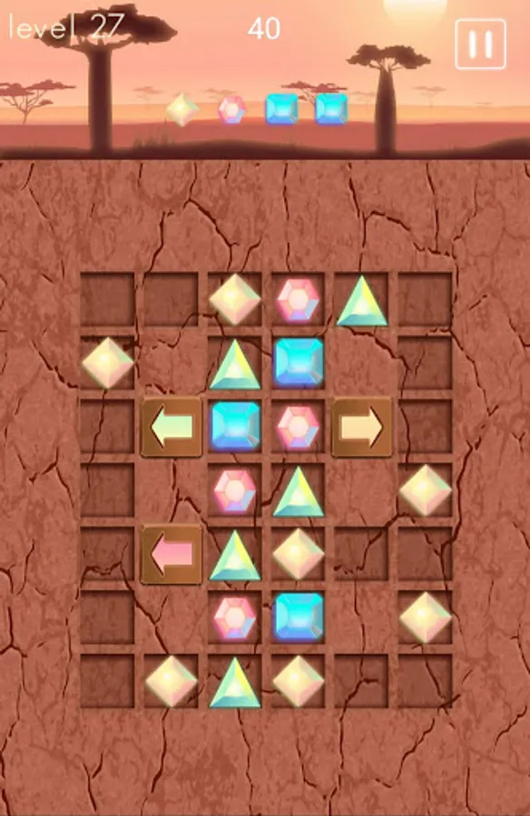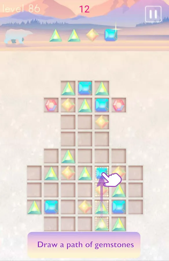 Place at least two gems together, to make them disappear. For this, use the empties spaces on the grid to place new gems by drawing a path.
