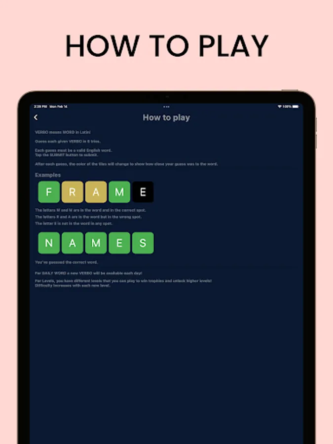 Guess the hidden words to become the Verbo Wordling Champion, acquire points, unlock more levels, compete with other wordlers around the world and win many trophies