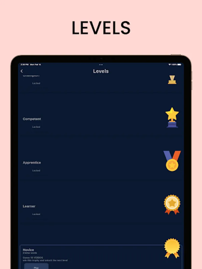 This is a relaxing word / vocabulary game with 14 levels. Each level has a given number of words that must be guessed to win a trophy and unlock the next level.