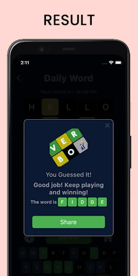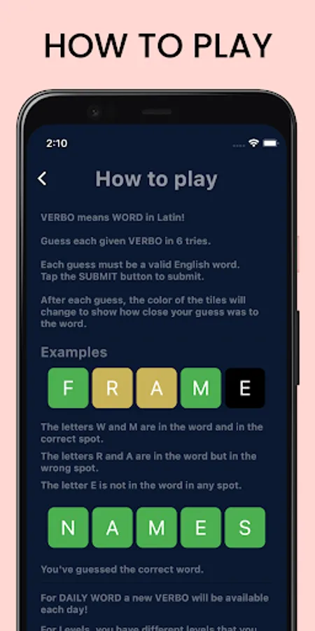 Each guess must be a valid English word. Tap the SUBMIT button to submit. After each guess, the color of the tiles will change to show how close you are to guessing your word.