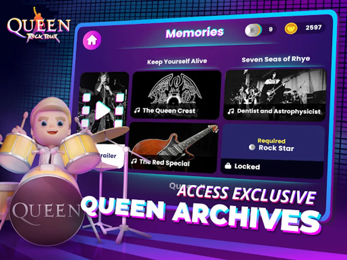 Master the guitar, drums, bass, vocals, and even the piano as you tap tiles to become the ultimate rock music legend. Witness breathtaking performances with amazing graphics and unique stage animations inspired by the iconic style and presence of Queen. Unlock and collect fun music trivia facts and exclusive band images from the official Queen archives.