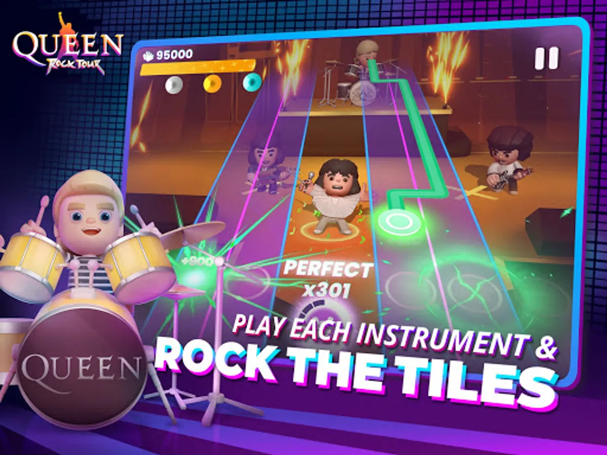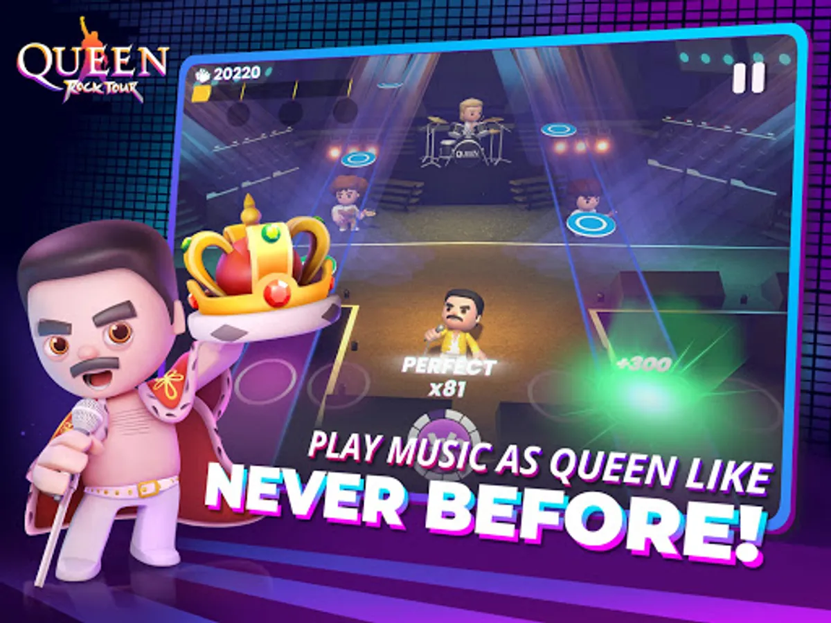 Hit the stage and perform with the entire band—Freddie Mercury, Brian May, Roger Taylor and John Deacon—as you unleash your music talents to play thrilling guitar riffs, heart-pounding drum solos and much more. All you need to do is tap the tiles in time with the rhythm, and become a part of these heroes' band!