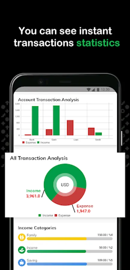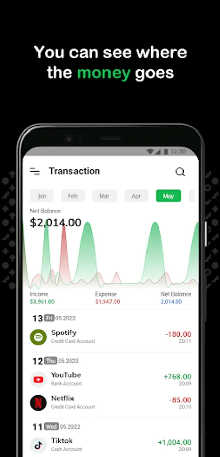Based on the data entered, you can instantly see your expense by category and changes between each month. And you can see the change of your assets and income/expense indicated by a graph as well.