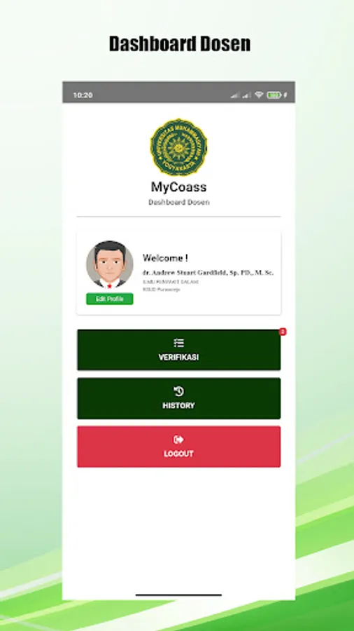 MyCoass Lecturer is an application that is used within the scope of FKIK UMY to carry out various kinds of guidance activities. Monitoring and scoring of students by supervisors. Lecturers log in with the data they have, then the lecturer can verify student activities and can provide scores in several student activities. Lecturers can also view the history of verification data that has been done.