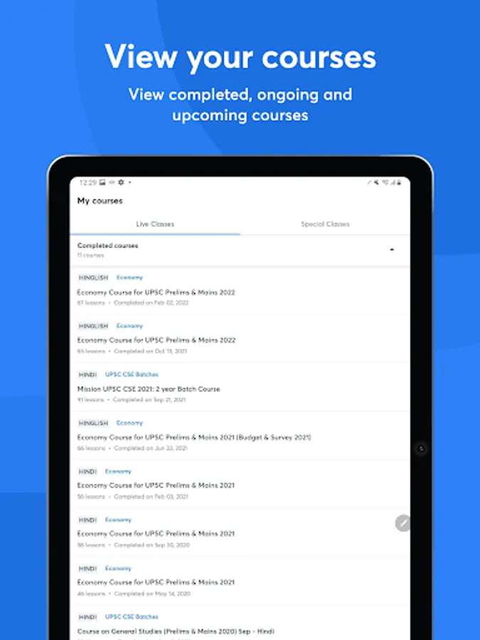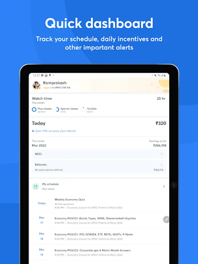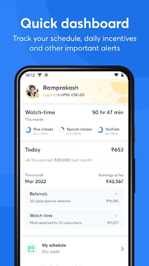 📱Quick dashboard: Easily track your schedule, daily incentives, watch-time on your classes, and other important alerts in a single tab.