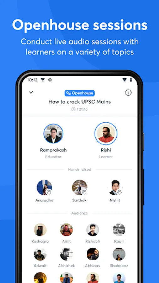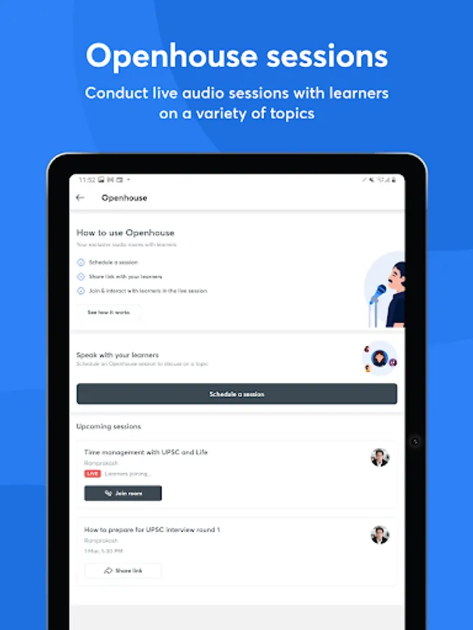 🎙Openhouse: Schedule live audio sessions with learners to discuss topics, give guidance, motivate them, or clarify any doubts.