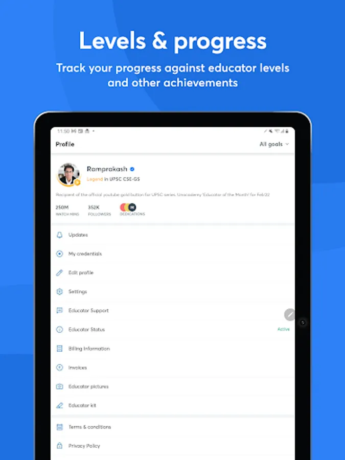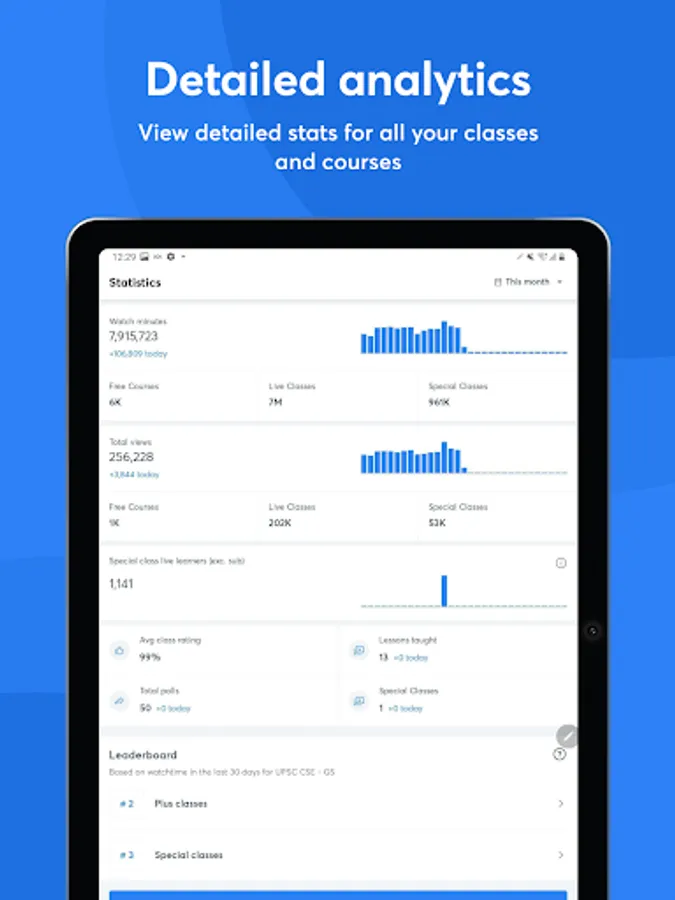 📊 Statistics: Get detailed stats about watch minutes, views, ratings, reviews, learner attendance, and more. Understand how learners are engaging with your content on the Unacademy platform.