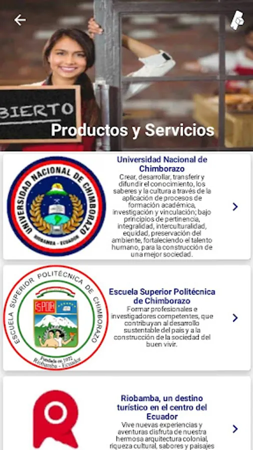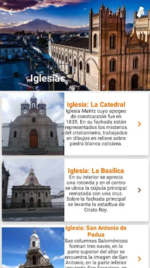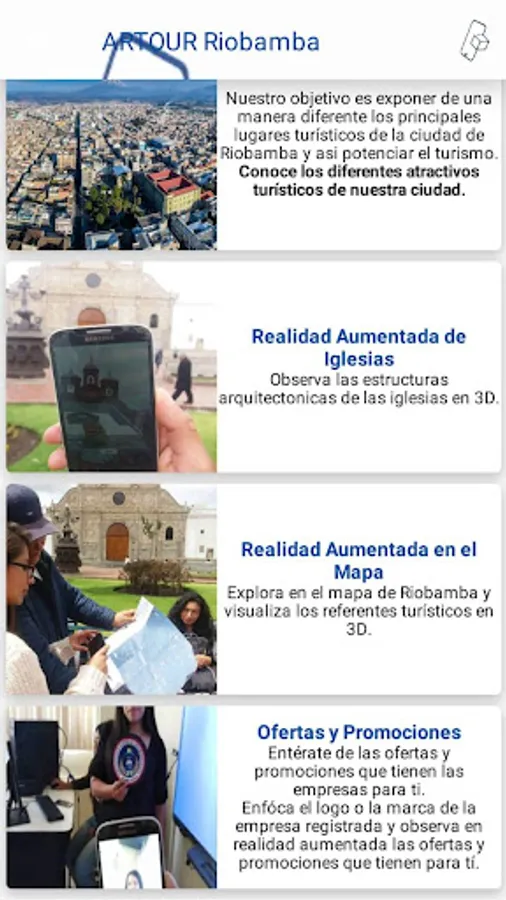 Through this application you will be able to know the different tourist attractions of the city of Riobamba. In the augmented reality section; by focusing on the structure or image, the application allows you to show in 3D the main tourist attractions of the city; like the churches (The Basilica and The Cathedral) in Augmented Reality in an interactive way.