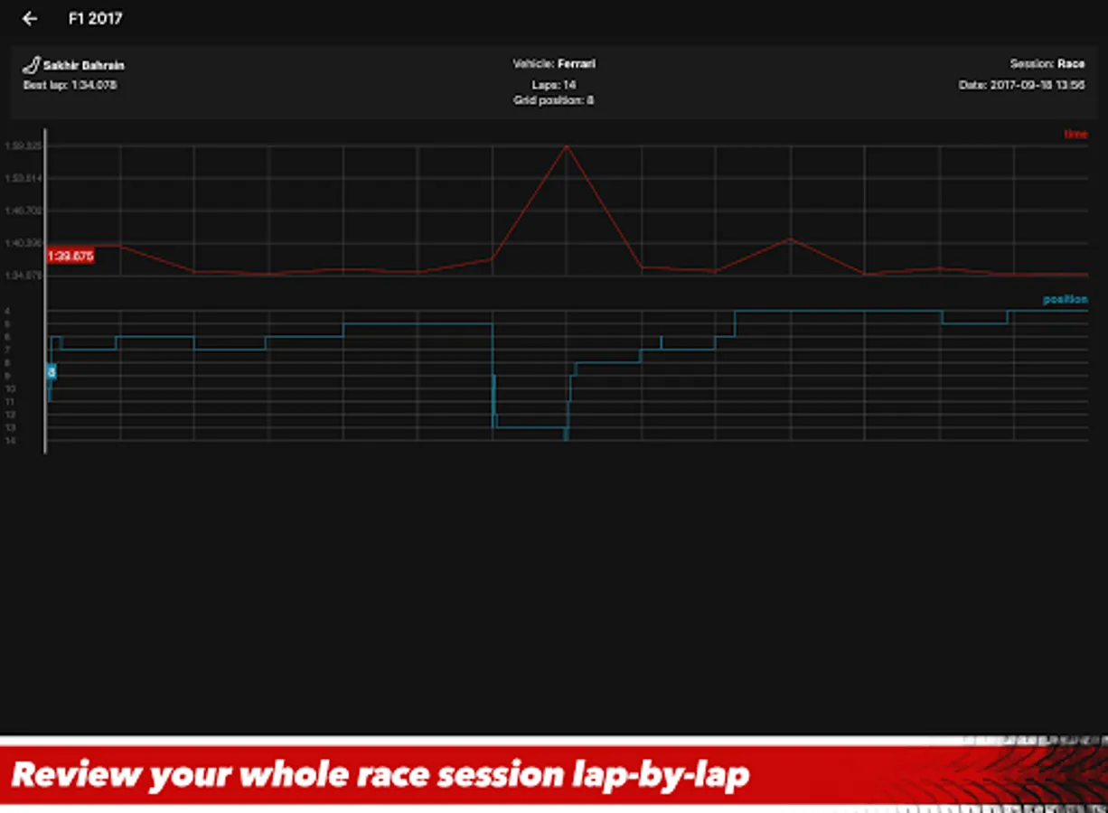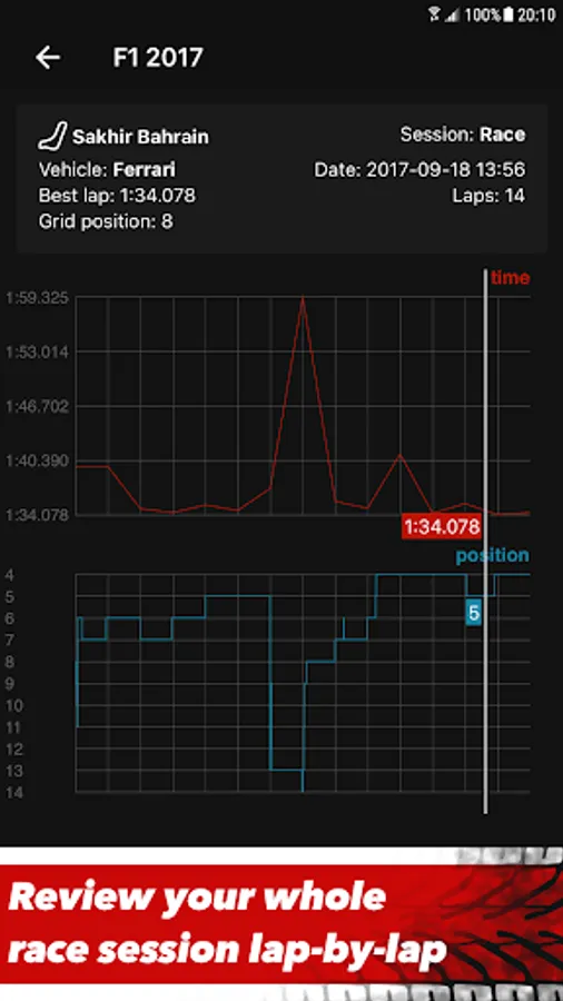 - Session view with per-lap information (positions, timings, tyre compound, pit-lane status, etc).