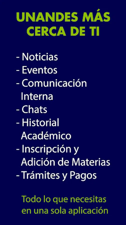 APP UNANDES is the smart answer to your university experience. The application offers essential information about the University of Los Andes - Bolivia. Includes: current news, chats and forums for interaction with administrative and academic areas. It allows actions such as: Assignment and registration to subjects, follow-up of procedures, financial and academic information. Registration and registration for events, courses, seminars and workshops.