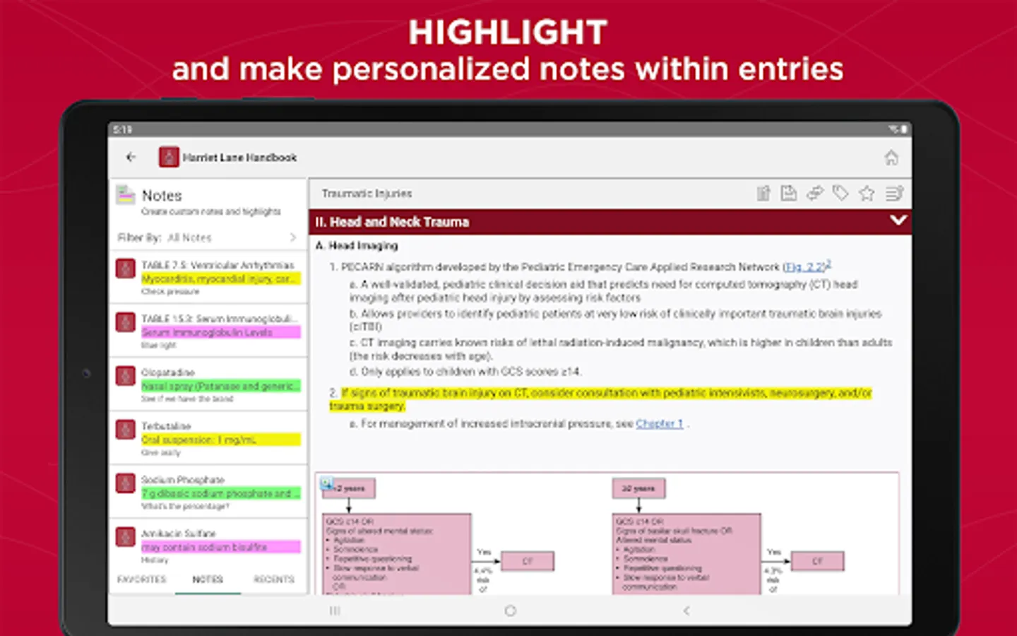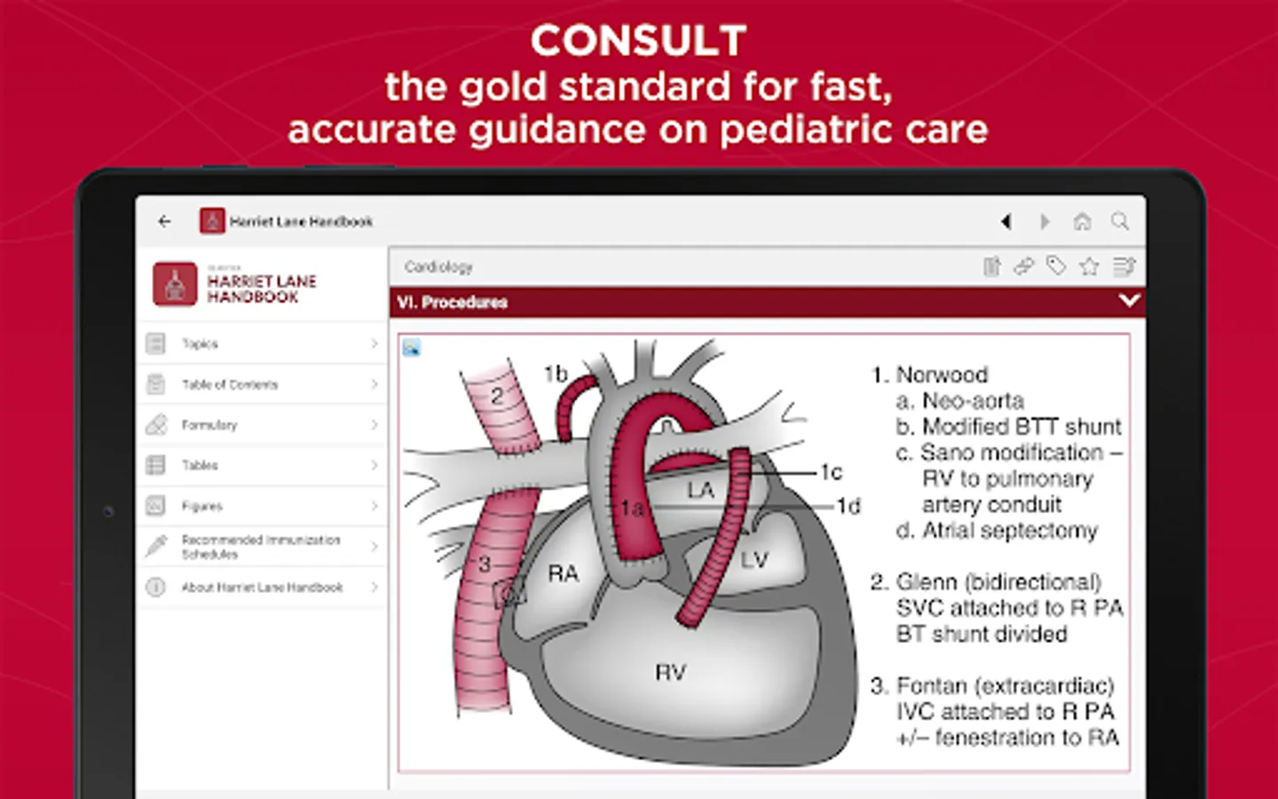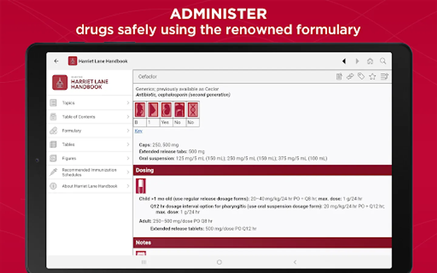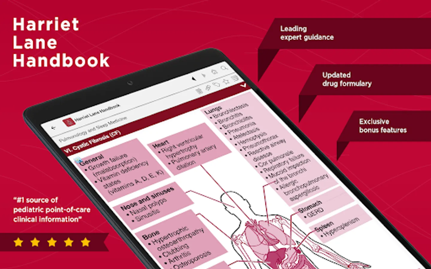 Written by pediatric residents from the Johns Hopkins University School of Medicine, Harriet Lane Handbook is the authoritative resource for interns, residents, and practitioners. Download this resource to review disease information or search figures, algorithms, tables, and charts. Check medication details in the new, fully-updated drug formulary which provides the standard in pediatric care. Quickly confirm diagnoses across a wide range of pediatric conditions and consult the most recent management recommendations, immunization schedules, procedures, and therapeutic guidelines specific to children.