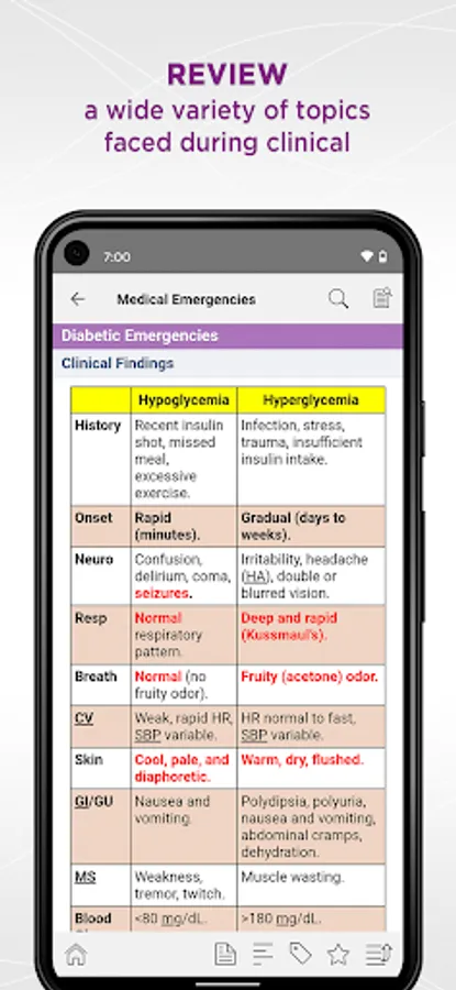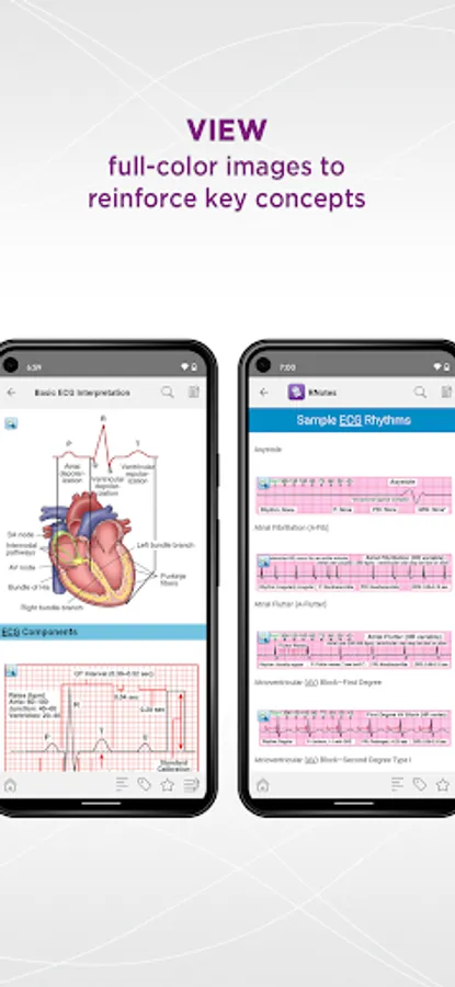 • Details for interpreting ECG, lab values, priority interventions, and more