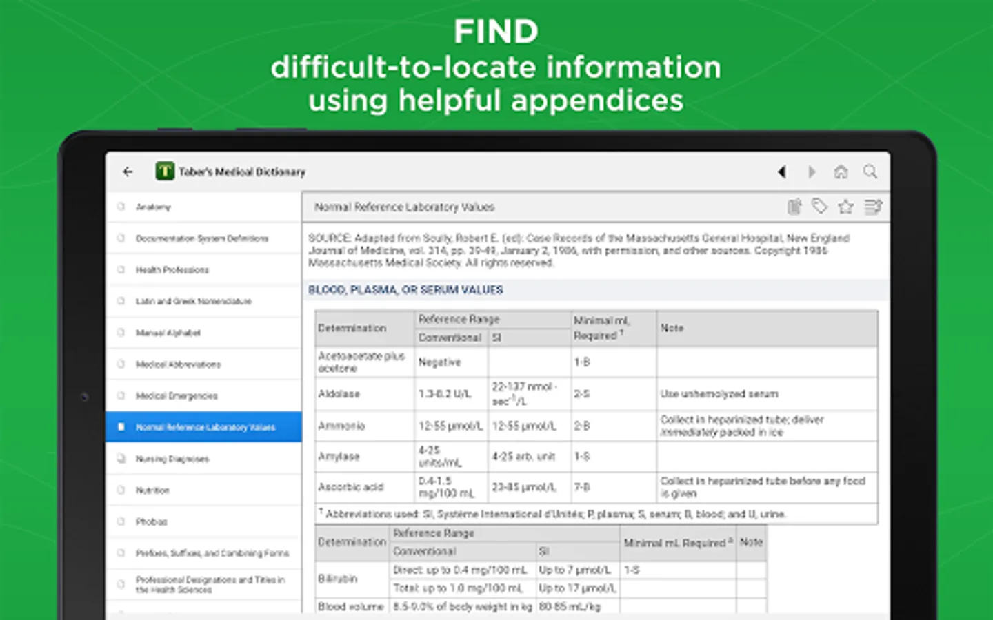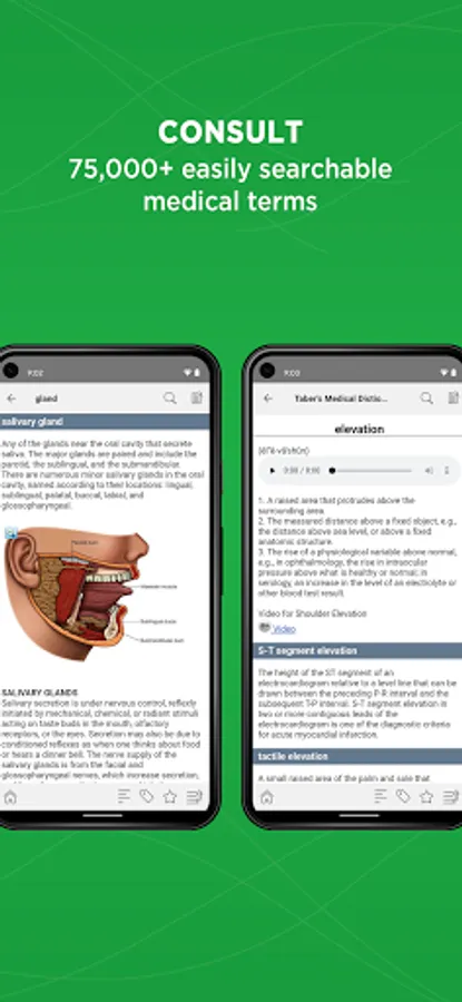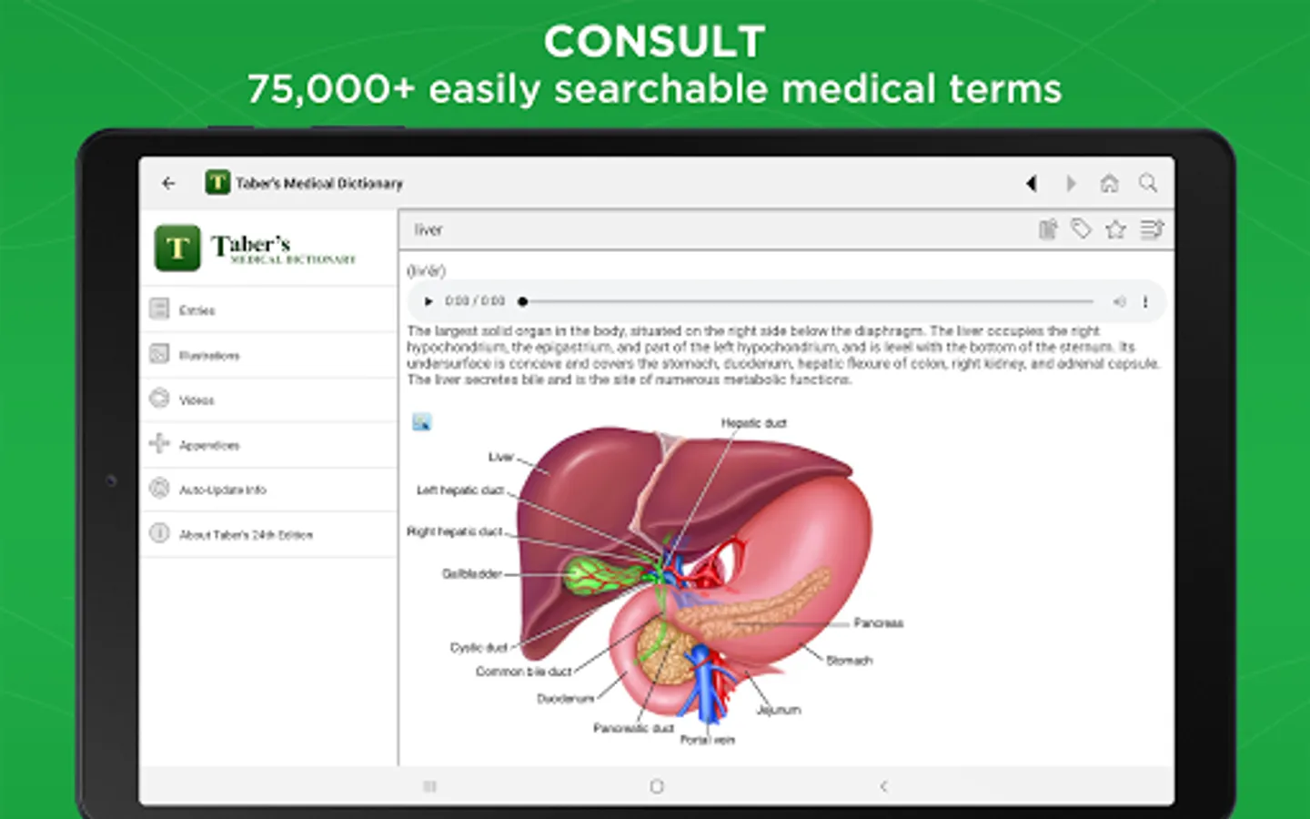 Taber’s Medical Dictionary now contains over 75,000 terms, 1,300 photos, 33,700 audio pronunciations, 130 videos, and 600+ Patient Care Statements from the latest edition. Taber’s goes beyond the in-depth definitions and provides nutrition and alternative therapy, medical abbreviations, symbols and units of measurement, immunization schedules and more.