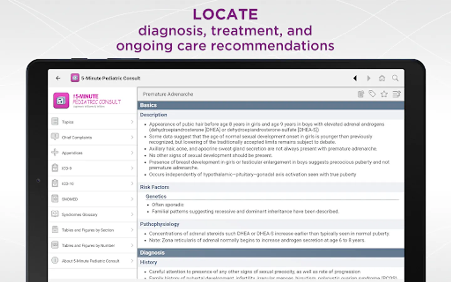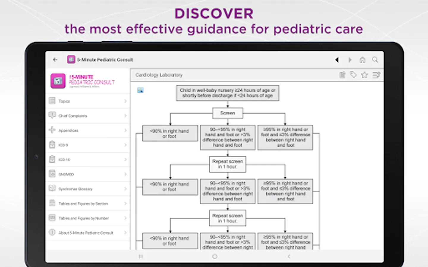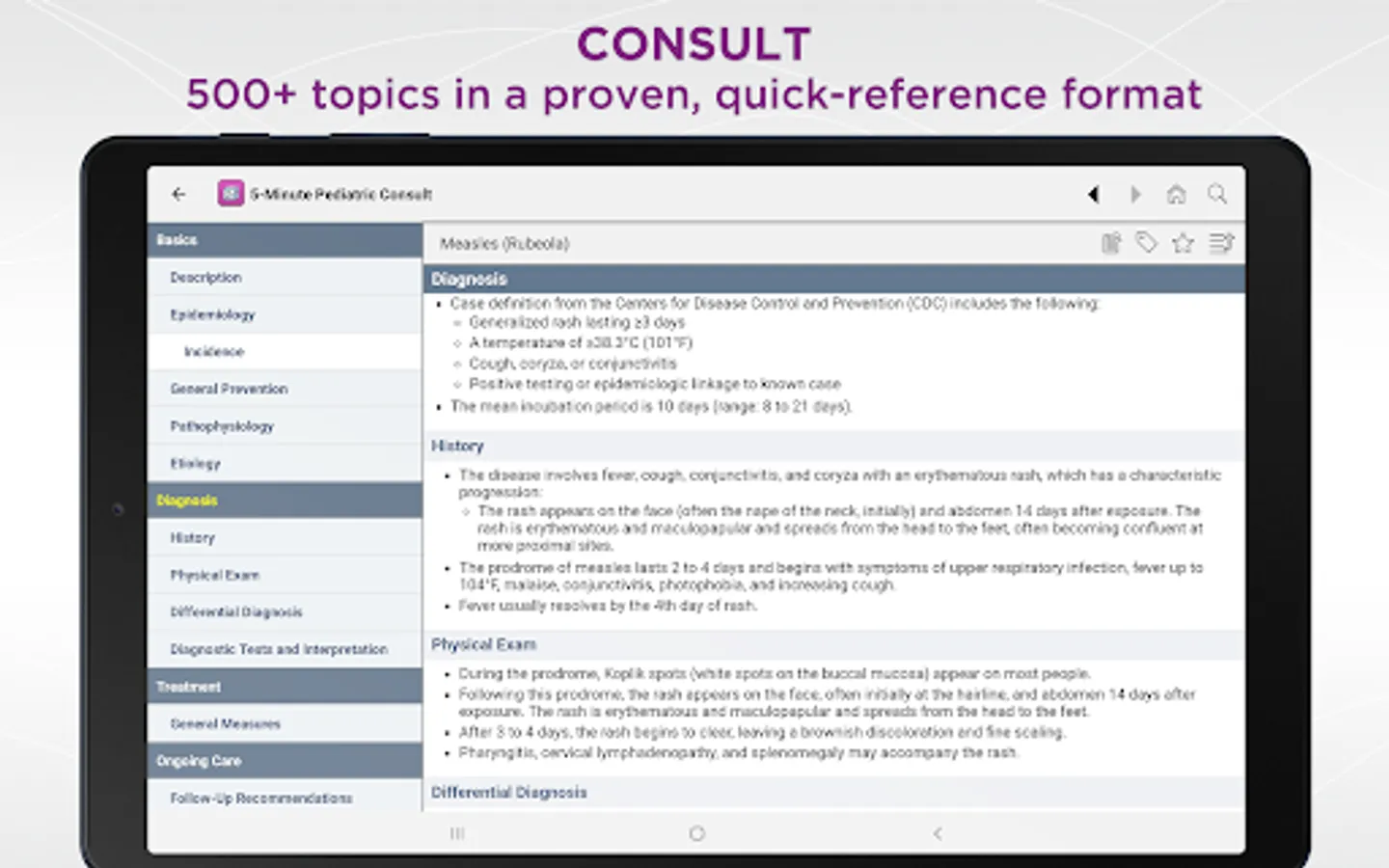 FREE PREVIEW – View select topics to explore pediatric conditions organized in the famous 5-Minute style. Quickly navigate the detailed entries and see how this app will help you find answers fast and improve pediatric patient care.