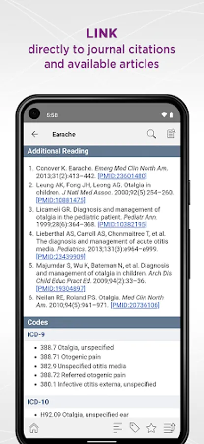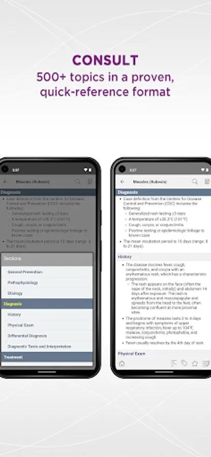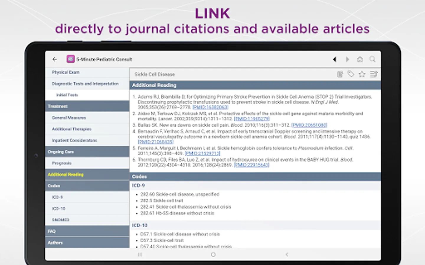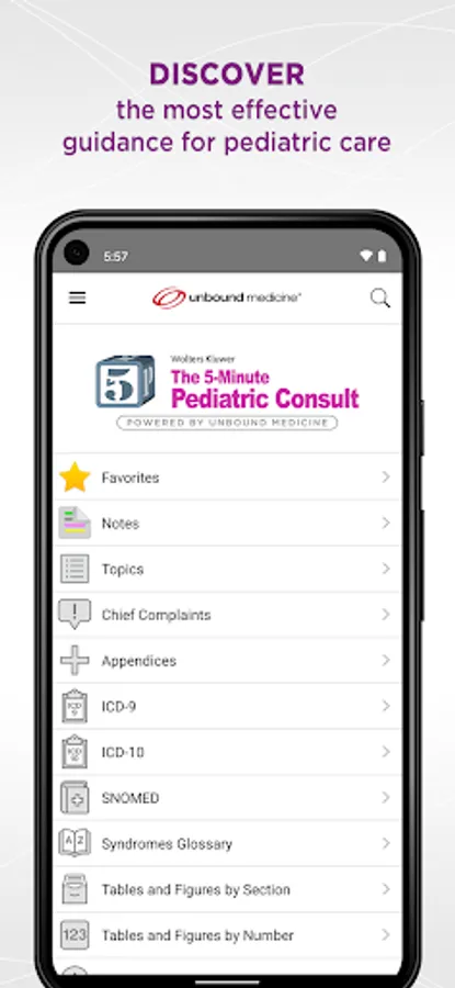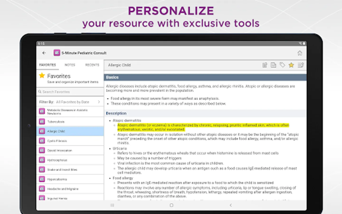 FREE PREVIEW – View select topics to explore pediatric conditions organized in the famous 5-Minute style. Quickly navigate the detailed entries and see how this app will help you find answers fast and improve pediatric patient care.
