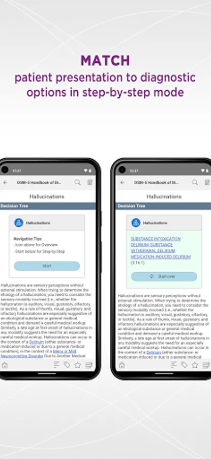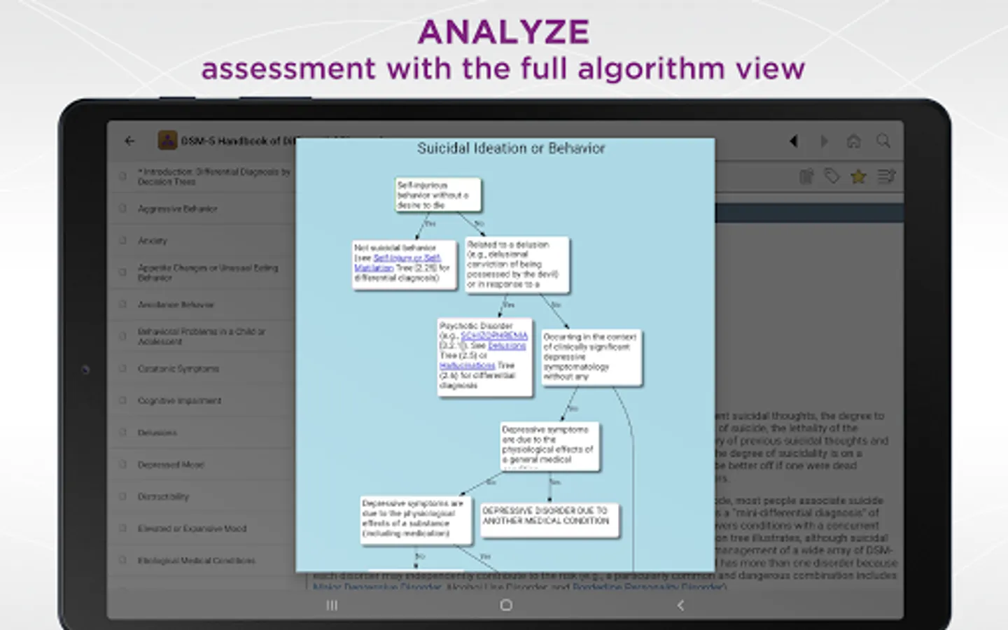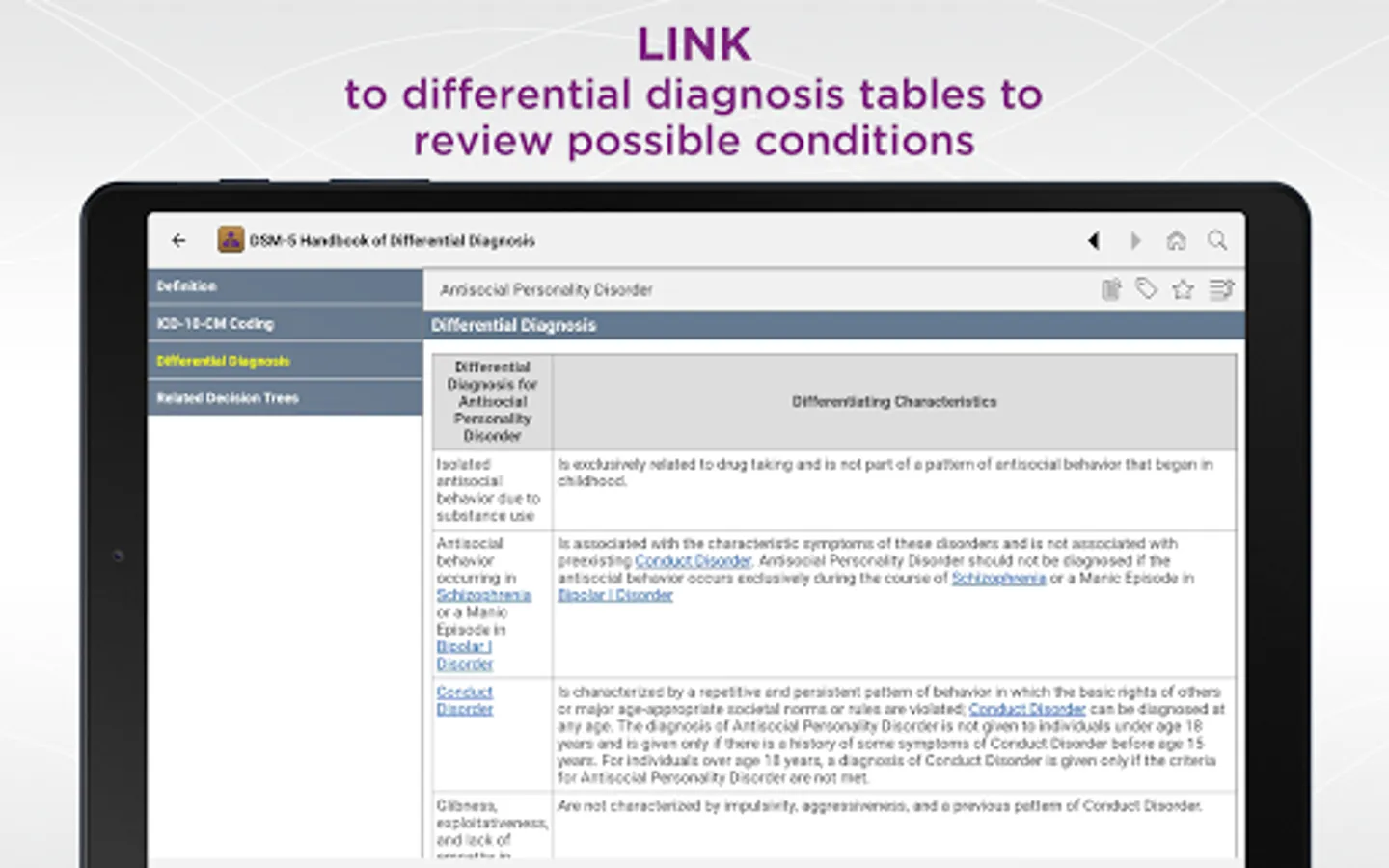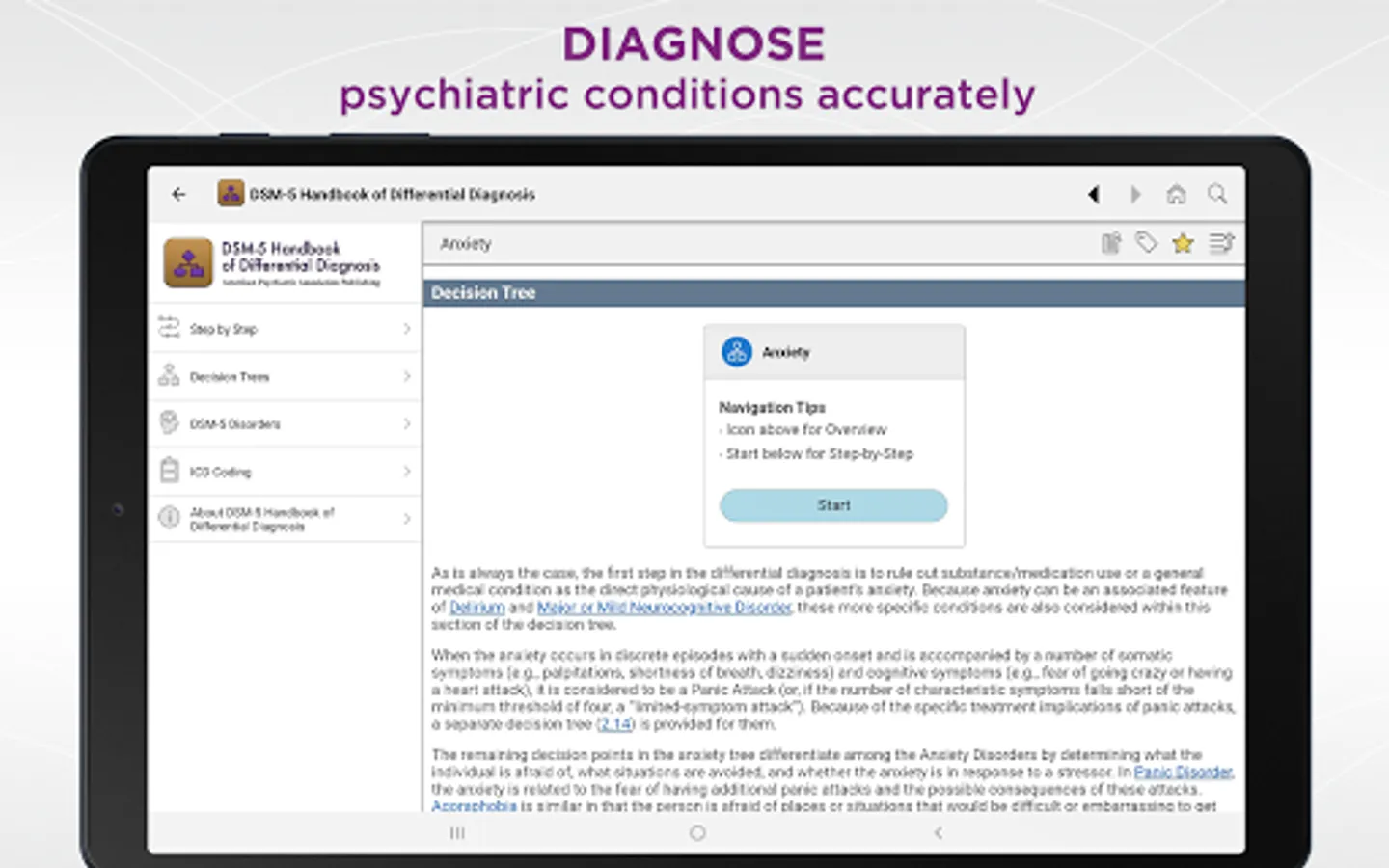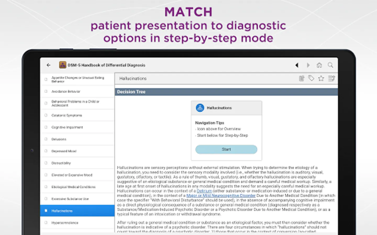 FREE PREVIEW – View select topics to experience the 6-step diagnostic framework and interactive decision trees to discover how this app can help all health care professionals narrow down an accurate psychiatric diagnosis.