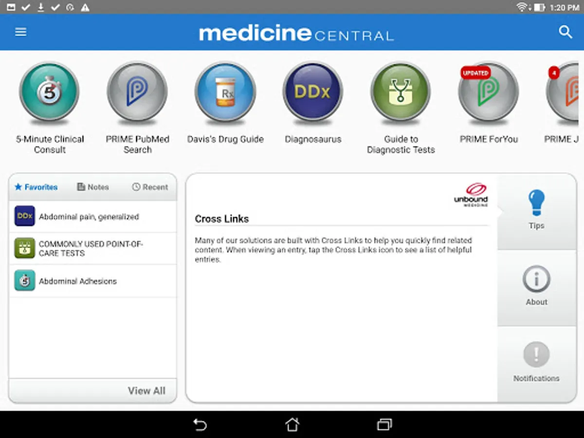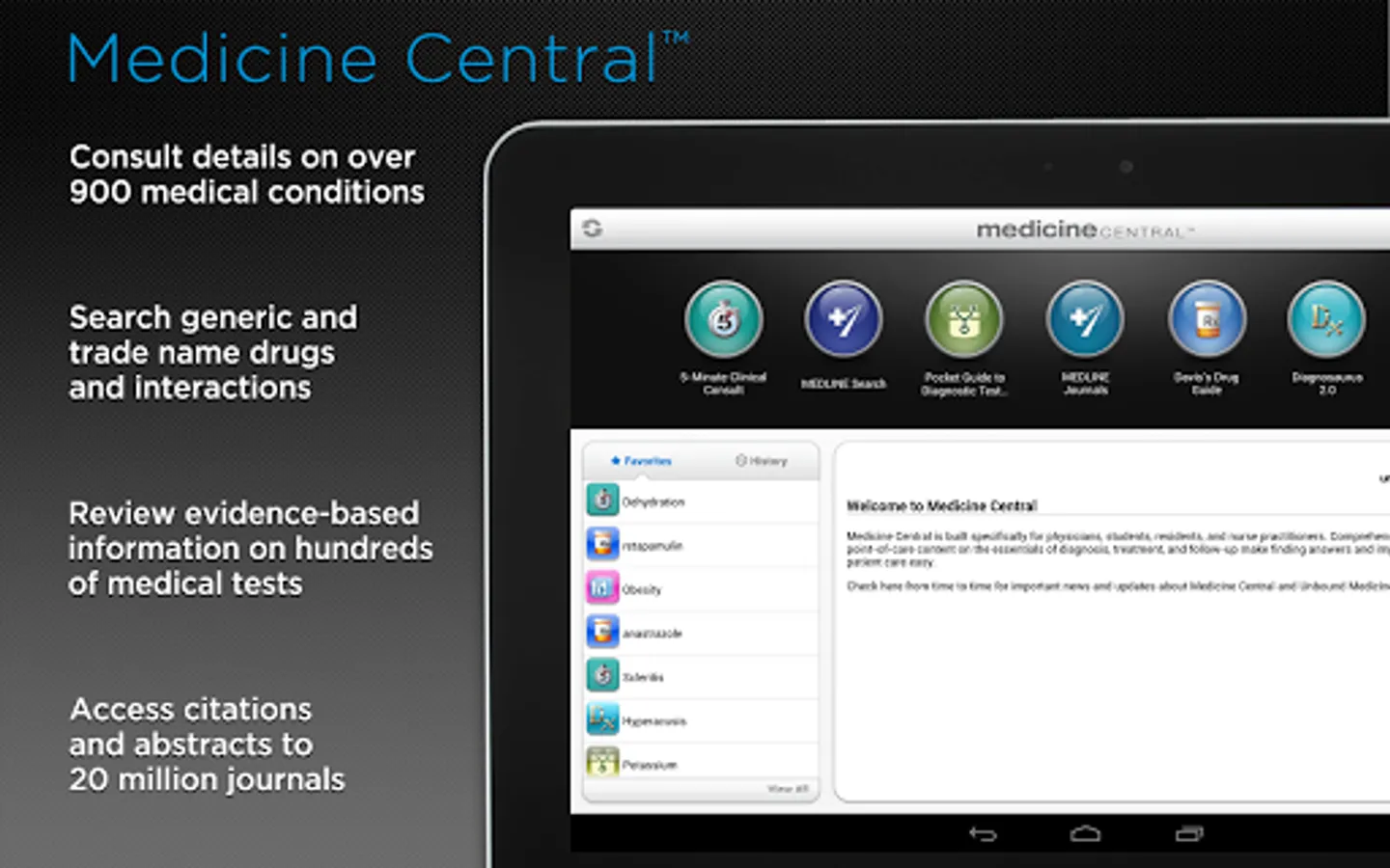 Medicine Central is an integrated mobile and web reference built specifically for physicians, residents, students, and nurse practitioners that includes 5-Minute Clinical Consult, Davis’s Drug Guide, McGraw-Hill’s Diagnosaurus®, Pocket Guide to Diagnostic Tests, and MEDLINE Journals.