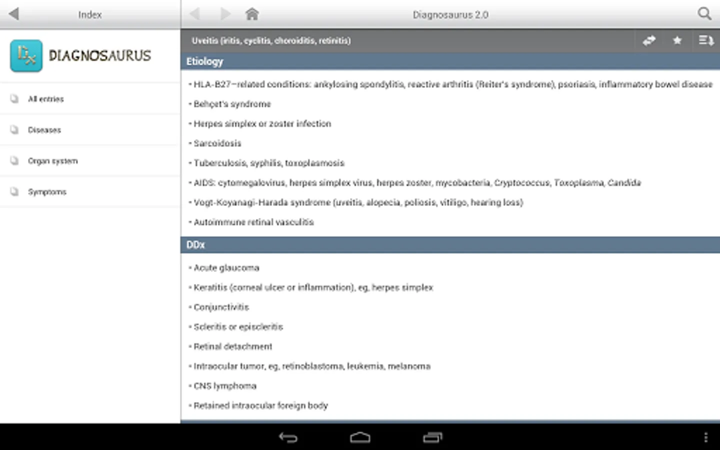 Diagnosaurus allows you to quickly search over 1,000 differential diagnoses by organ system, symptom, disease, or you can view all entries. The valuable "See Related DDx" feature within each listing helps you consider alternative diagnoses and quickly link to those entries.