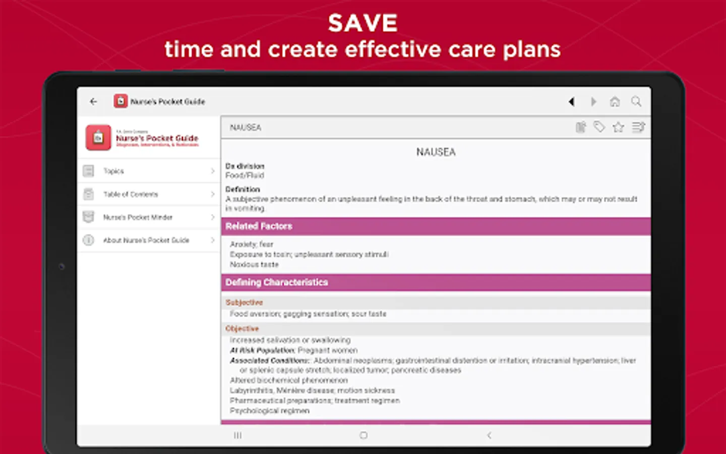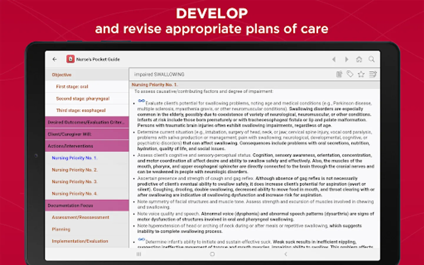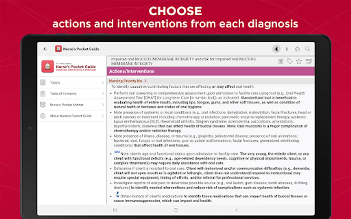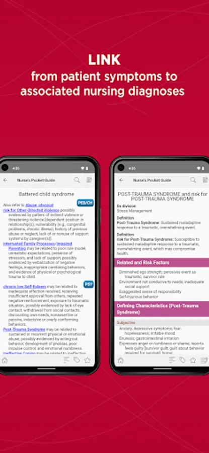 Make accurate nursing diagnoses and develop effective care plans with this comprehensive app. Each diagnosis listing includes a definition, related factors, defining characteristics, prioritized actions/interventions, NIC/NOC classifications, and documentation guidelines. Or, choose by patient symptom and link directly to associated nursing diagnoses.