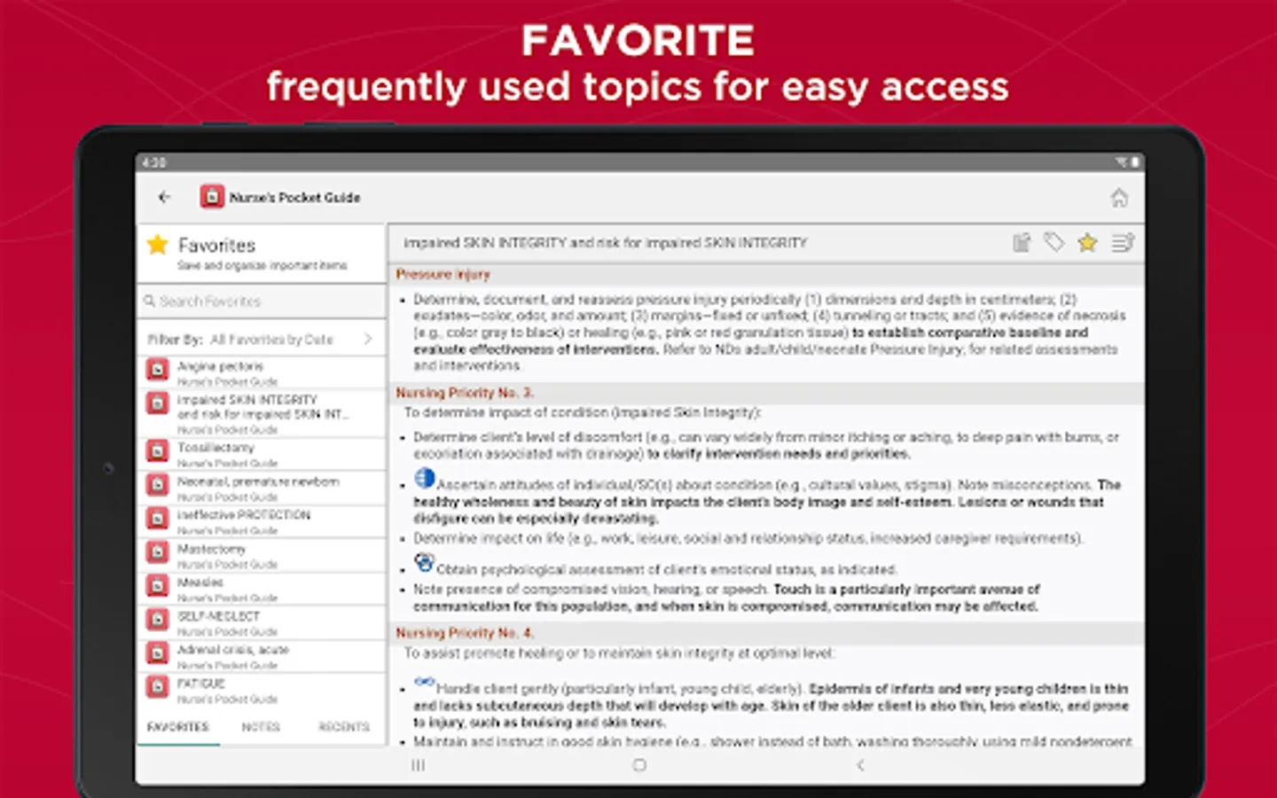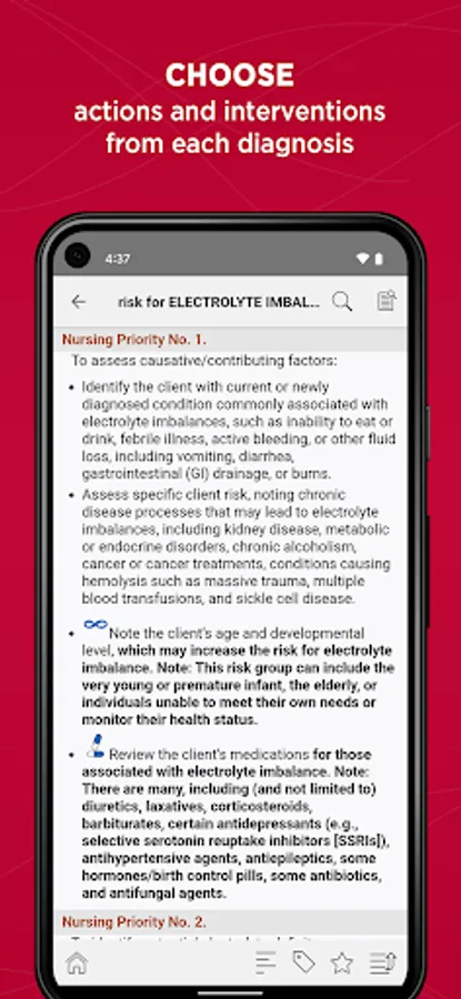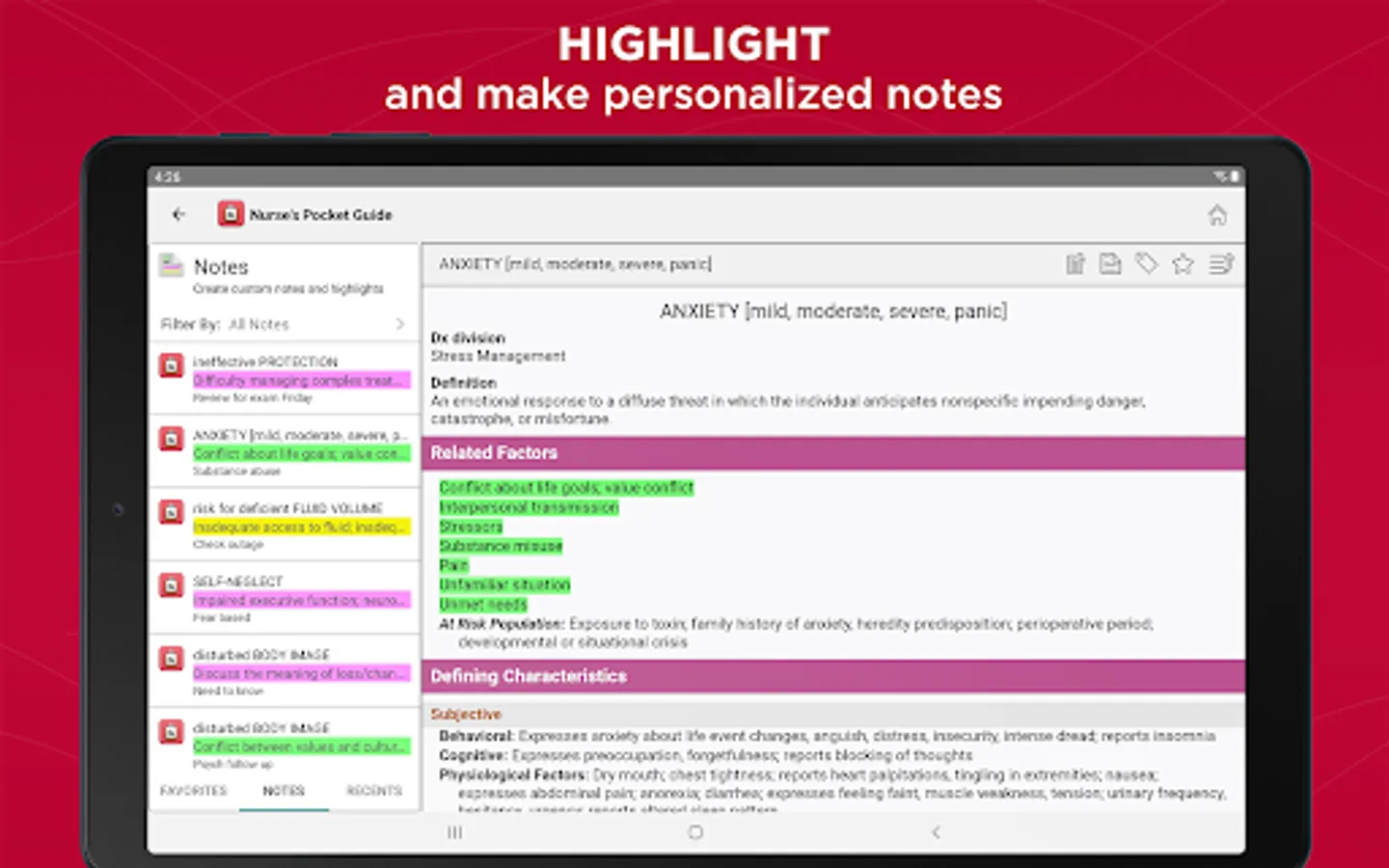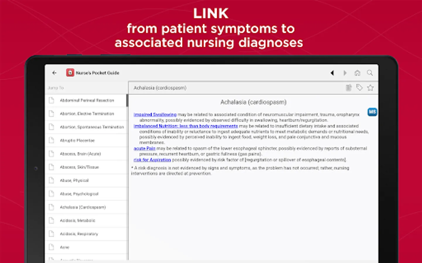 Make accurate nursing diagnoses and develop effective care plans with this comprehensive app. Each diagnosis listing includes a definition, related factors, defining characteristics, prioritized actions/interventions, NIC/NOC classifications, and documentation guidelines. Or, choose by patient symptom and link directly to associated nursing diagnoses.