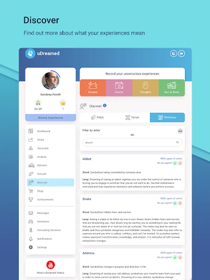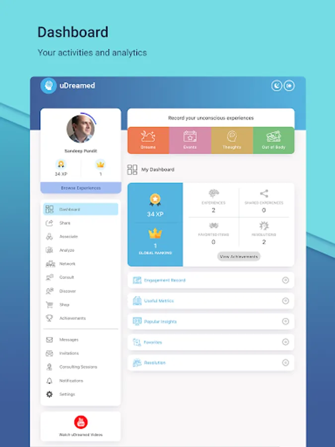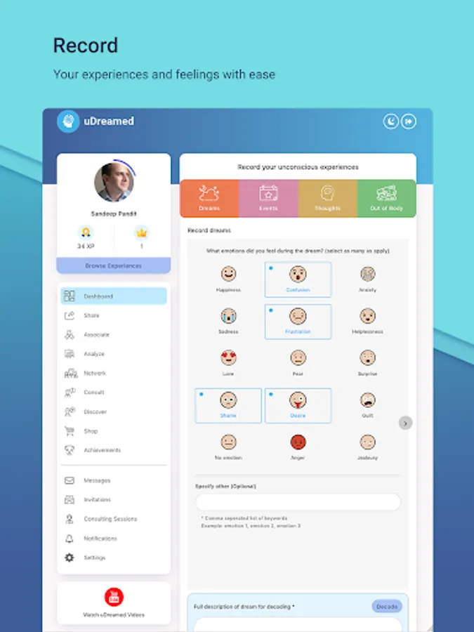 The vision of uDreamed is to enable people around the world to tap the power of the unconscious mind to realize their full potential and improve their quality of life. The company's core service offerings include a mobile application and a website that allows users to record, associate, analyze, match and share their unconscious experiences (e.g., dreams) and consult professionals to gain deep and unique insights. All of us possess powerful unconscious traits, emotions, memories, desires, motivations, inspirations, defenses and biases we are unaware of. These "hidden" processes operate outside our awareness but determine much of who we are, influencing our daily decisions, mood, behavior, preferences, perspectives, and interpretation of events. Accessing and harnessing the contents of the unconscious mind presents tremendous opportunity for individuals, society and organizations. Our service unlocks the power of the unconscious mind, opening up new possibilities for self-development, creativity, innovative problem-solving, and discovering new ways of living and adapting to a changing world. With this service, you can: