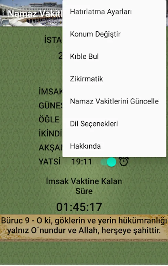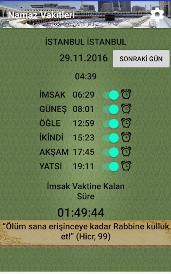 This application, which is very easy to use and designed as user friendly, allows you to reach the prayer times of 185 countries and at the same time you can be informed of the desired prayer warning message before prayer times. This program, which contains the Verses section in the interface, will give you new information in each entry and you will easily reach the verses from the Qur'an. Apart from prayer times, you will be able to make your remarks more easily with the zikirmatik feature. You can also find the easiest way to navigate the Kaaba, wherever you are with the Kaaba finder feature.