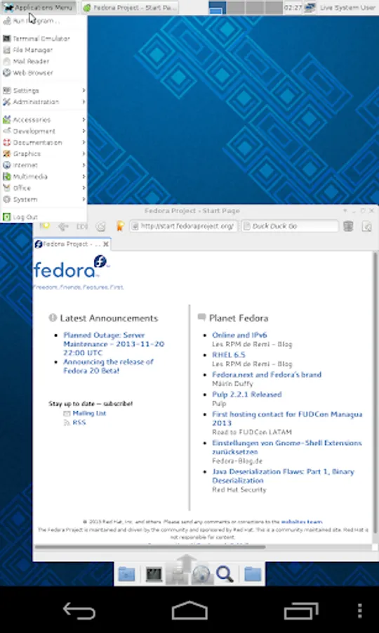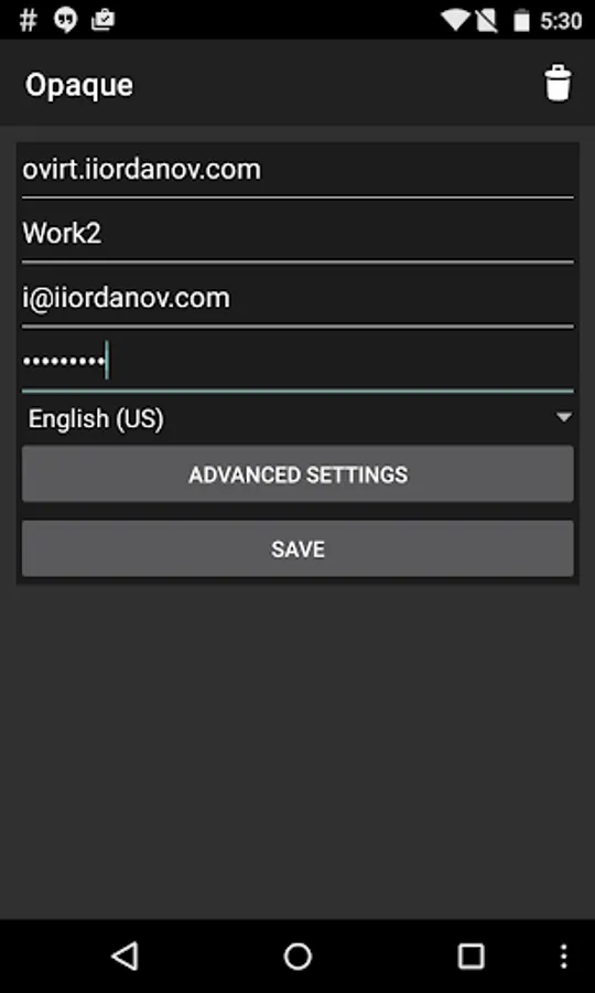 (3) If virtual machines are behind a RHEV/oVirt proxy, you may need to connect to them with Opaque by using a .vv file. To get a .vv file, you have to login through the oVirt/RHEV web interface and connect to your VM's console there. Chrome works perfectly with the web interface, and opens Opaque directly. With Firefox, you have to open a File Manager, and tap the file in the Downloads folder as soon as the download completes. The built-in Android Browser does not work for .vv downloading.