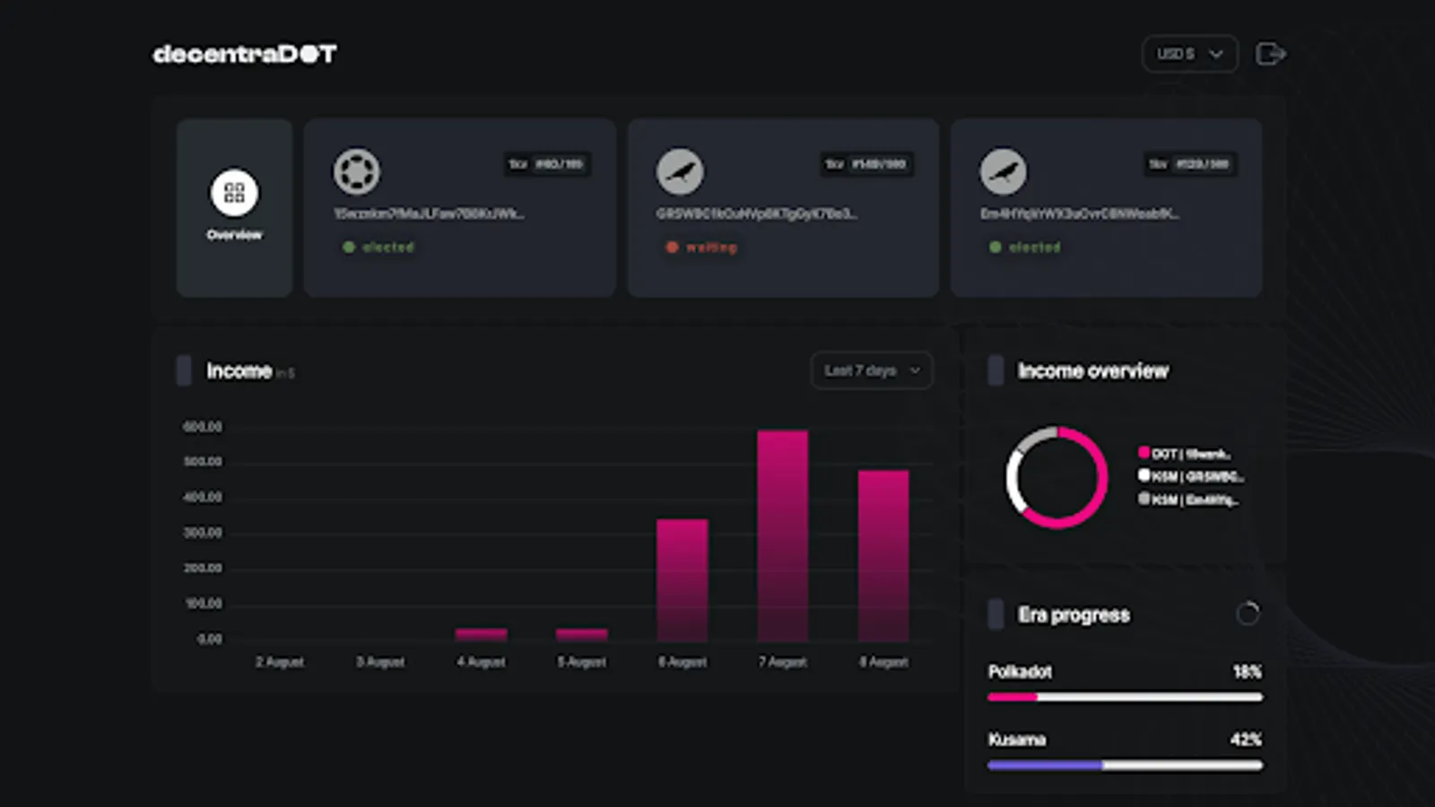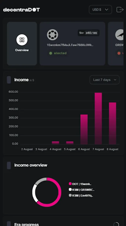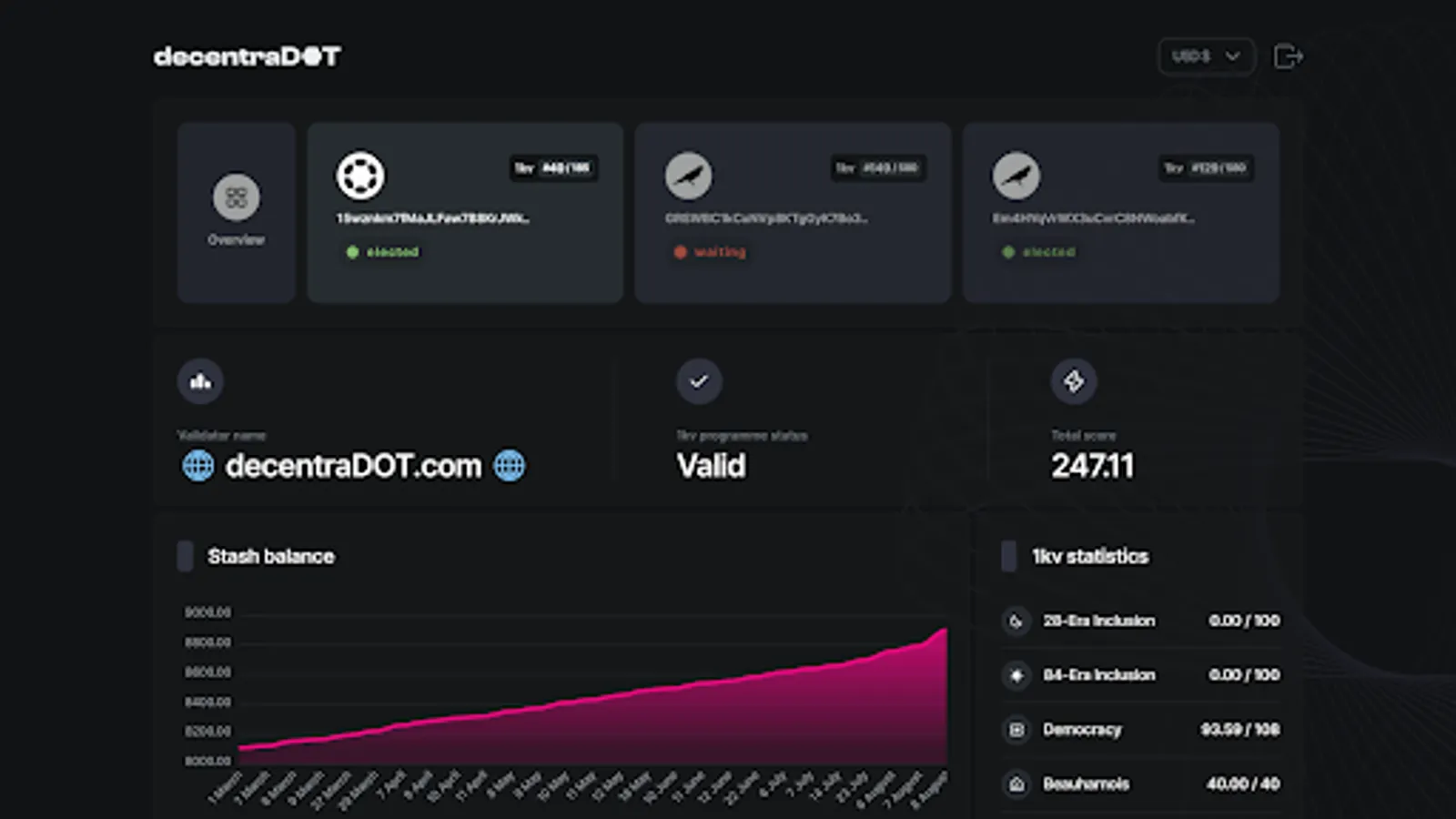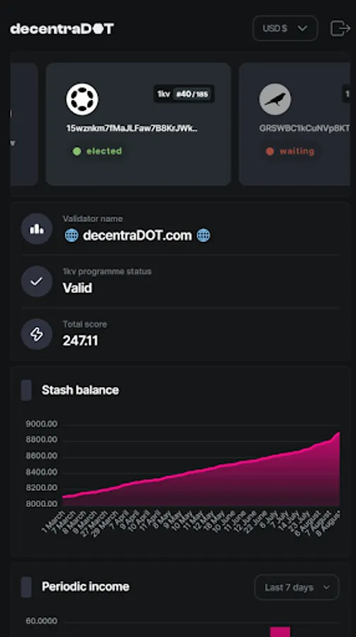 Easily track your Polkadot and Kusama validator performance using the DecentraDOT dashboard.