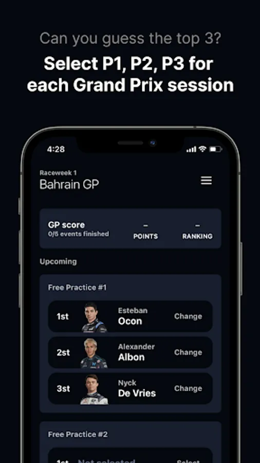 Introducing the ultimate Grand Prix prediction game! Do you have what it takes to guess the top three finishers of each session? Put your racing knowledge to the test and challenge your friends with this thrilling mobile app game.