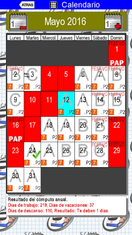 - Indication in calendar of the days considered holidays, for information on flexible shifts.