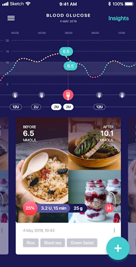 Undermyfork matches your meal pictures with blood sugar data from your CGM or glucose meter. The app automatically syncs blood sugar readings from supported CGMs, glucose meters, and apps.