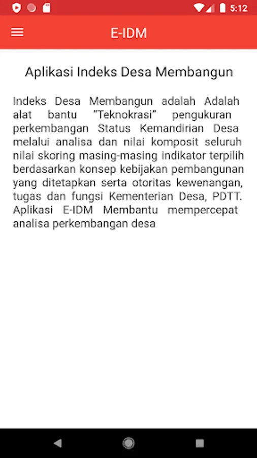 The Village Development Index is a tool for "Technocracy" to measure the development of the Village Independence Status through the analysis and composite values of all scoring values of each selected indicator based on the established development policy concept and the authority, duties and functions of the Ministry of Village, PDTT. E-IDM Application Helps accelerate the analysis of village development