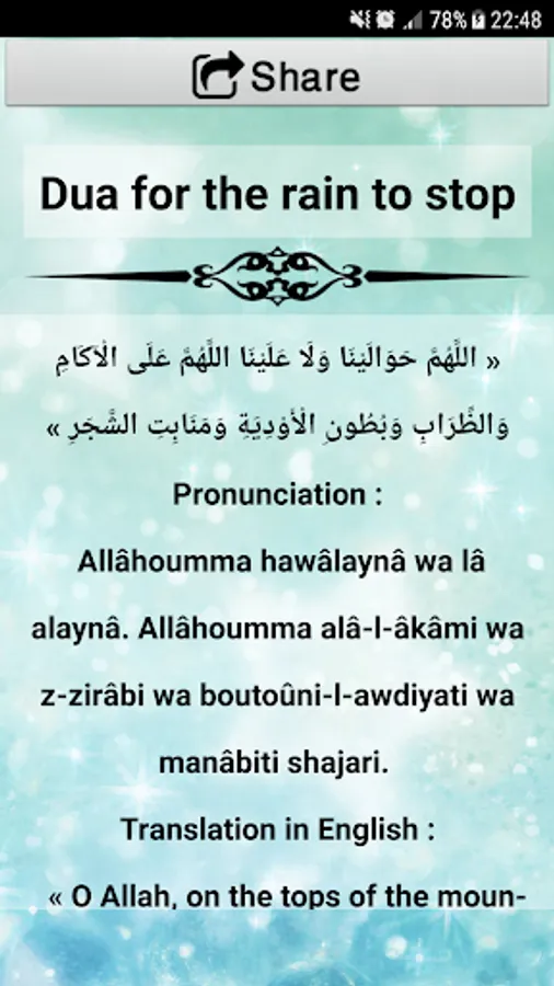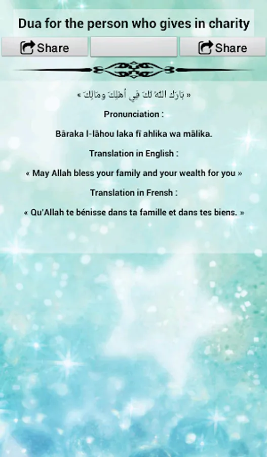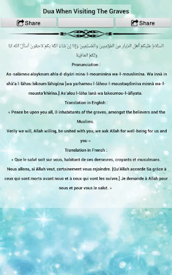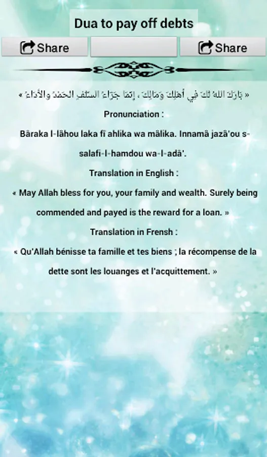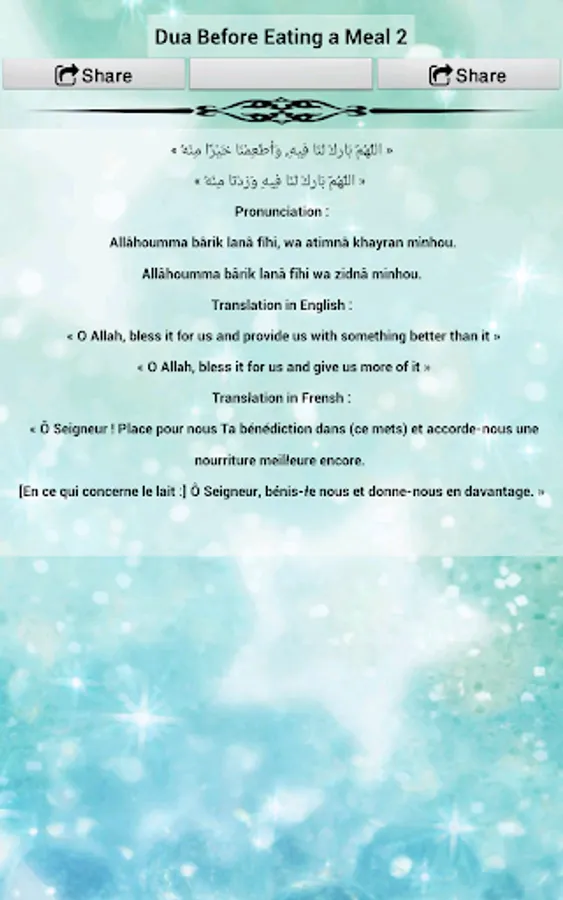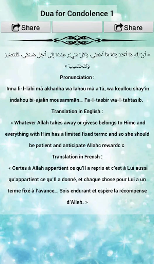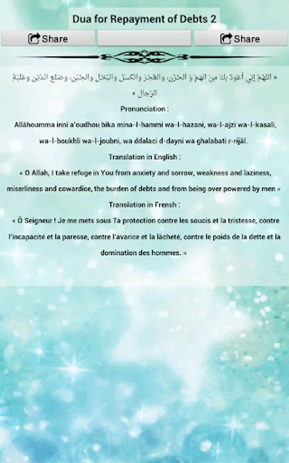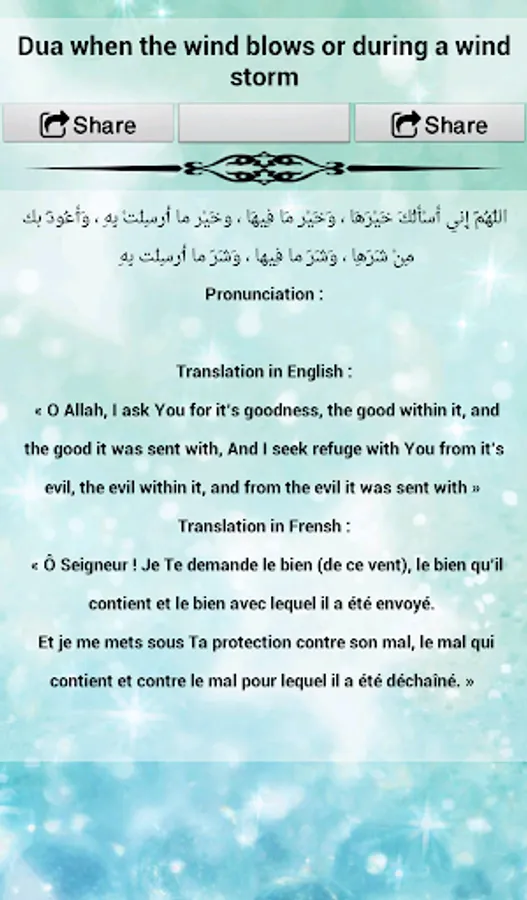 • Duas in Arabic text, English translation, french translation and transliteration.