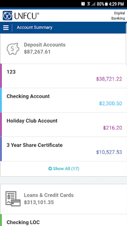 • View the current balance and transactions conducted in the last 90 days for each of your UNFCU savings and checking accounts, credit cards, loans and mortgages.