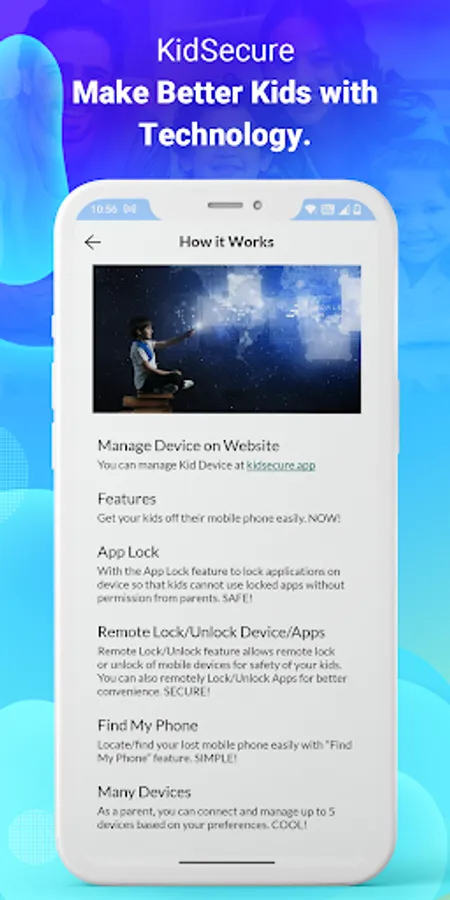 KidSecure is a safe and secure parenting control application to monitor and track the activities of kids on a mobile device. Monitor data usage, applock, remotely lock/ unlock devices are some of our amazing features that can help you manage screen time of your kids easily.
