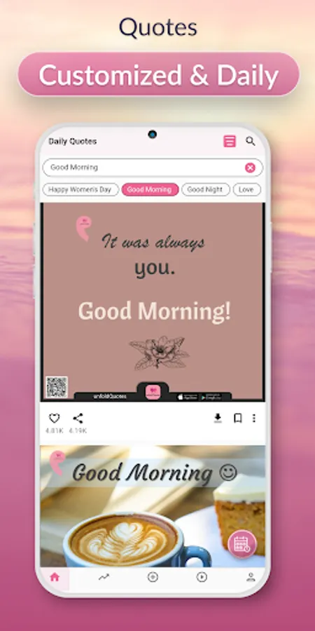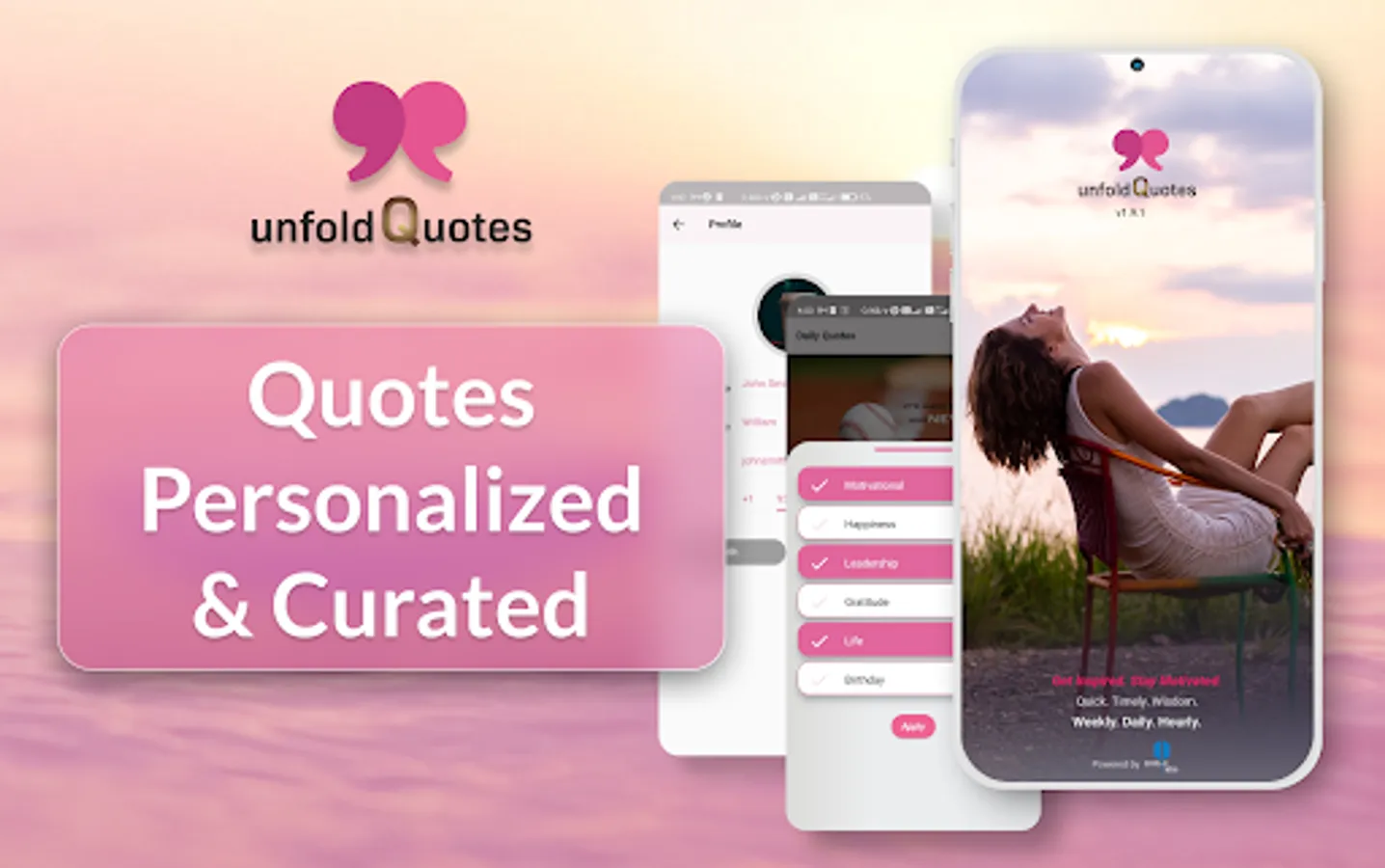 unfoldQuotes is the best Android application with a wide collection/variety of quotes that can be viewed based on categories. Get inspired with the wonderful quotes and share them within your circle of friends and family. This app is specially designed to motivate you with wise sayings and quotations for a wonderful life filled with happiness.