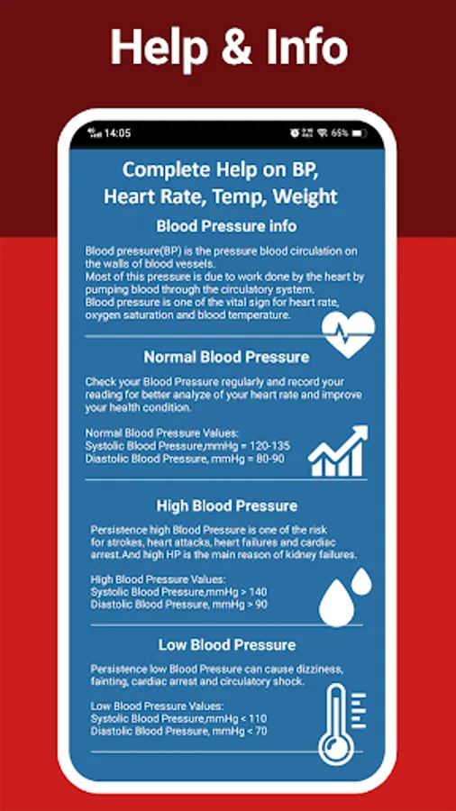 Get useful information about hypertension, blood pressure, pulse rate values, blood sugar, blood glucose concentration, weight, low level ranges, high level ranges, fever and body temperature.